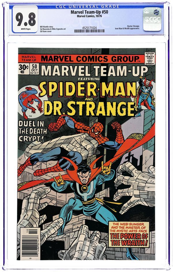 "The Mystery of the Wraith!" Part 3 of 4. Guest-starring Spider-Man, Doctor Strange, and Iron Man. Script by Bill Mantlo. Art by Sal Buscema (breakdowns), Mike Esposito (finishes), and Dave Hunt (finishes). Cover by Gil Kane and Dan Adkins. The wall-crawler needs help investigating the apparent death of Brian DeWolff two years ago. So he turns to the Master of the Mystic Arts for assistance! The trail of the Wraith leads to the DeWolff family crypt...but who or what is waiting inside? Captain Jean DeWolff enters first, then minutes later Spider-Man and Doctor Strange, and finally the Invincible Iron Man! It's a no-holds-barred battle down below! Origin of the Wraith. 36 pages. Cover price $0.30.
