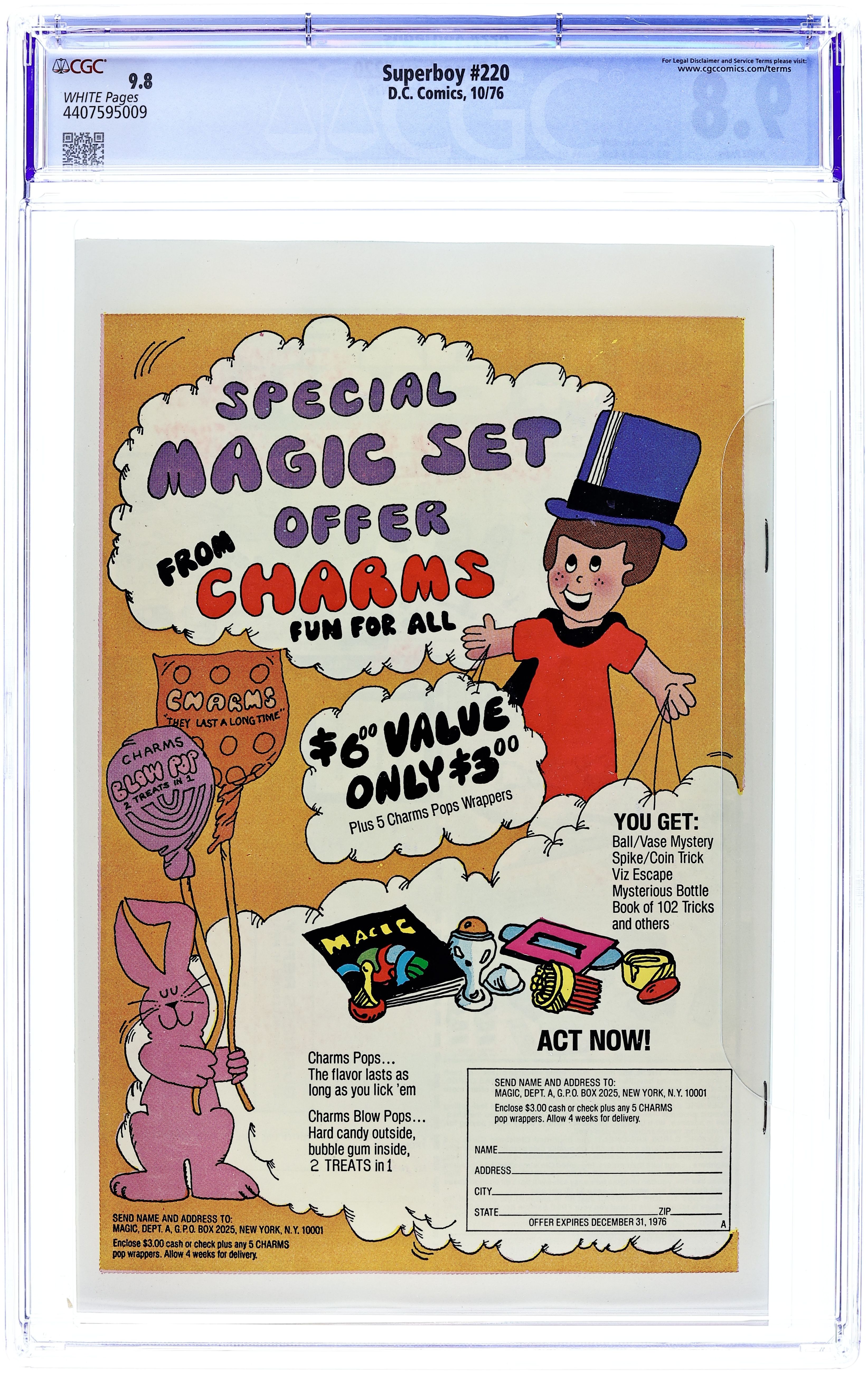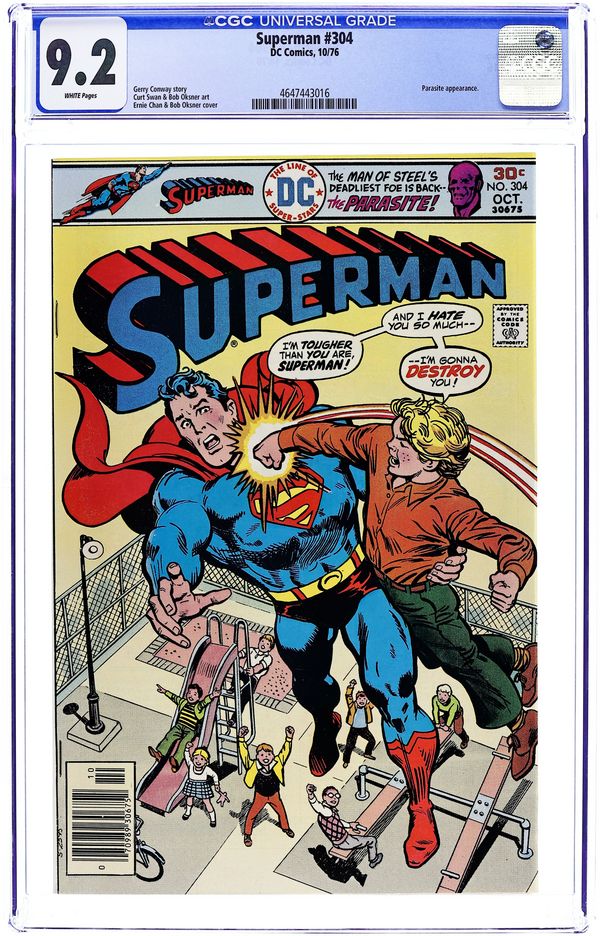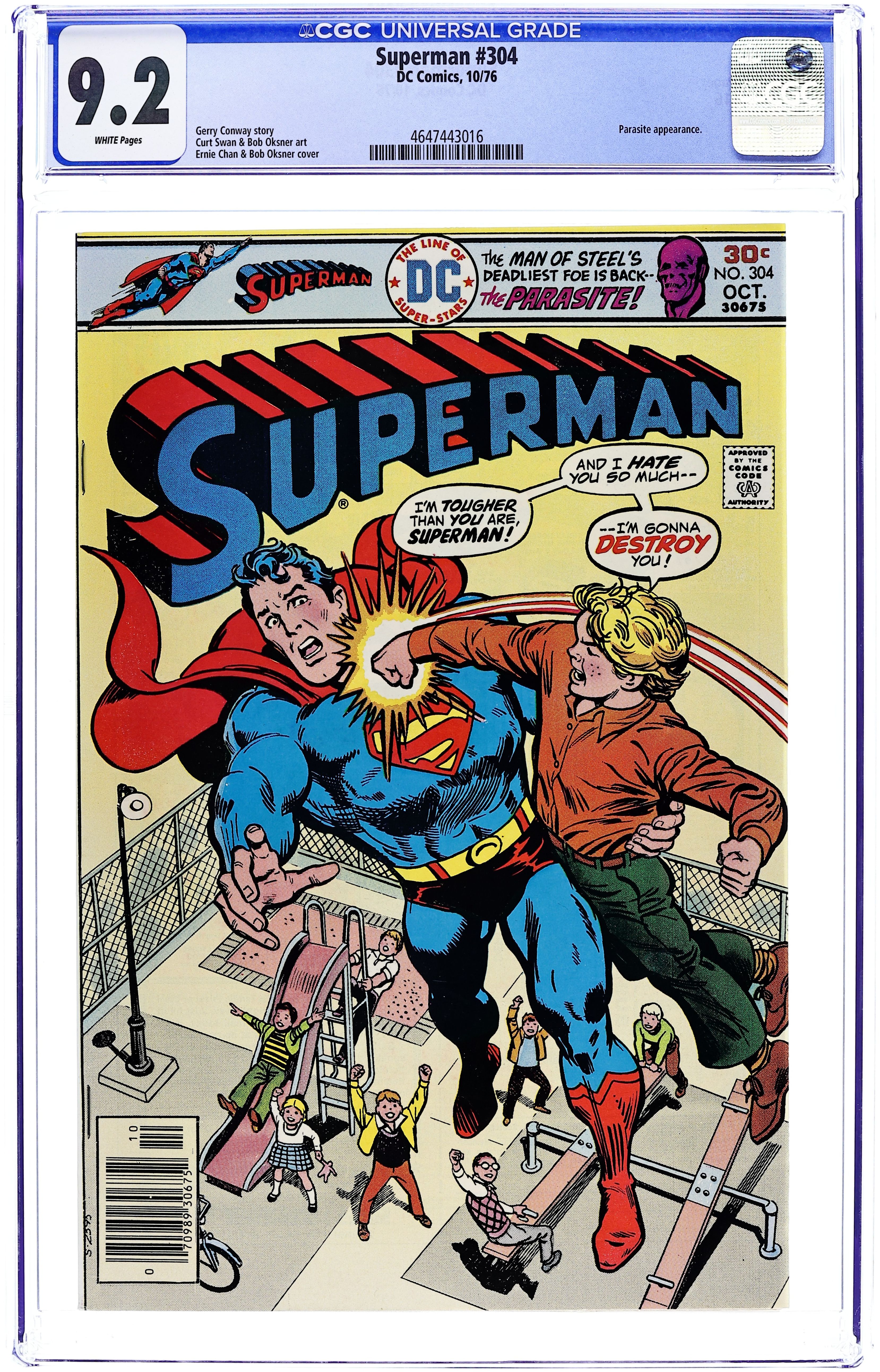 Cover pencils by Curt Swan, inks by Bob Oksner. The Parasite's Prism of Peril! starring Superman, Jon Ross, Dr. Jenet Klyburn, Eddie Foil, "Moose" MacElroy, The Parasite, and Lois Lane, script by Gerry Conway, pencils by Curt Swan, inks by Bob Oksner; Parasite attacks Superman by using a power-prism that gives other people super-powers. 36 Pages, Full Color. Cover price $0.30.