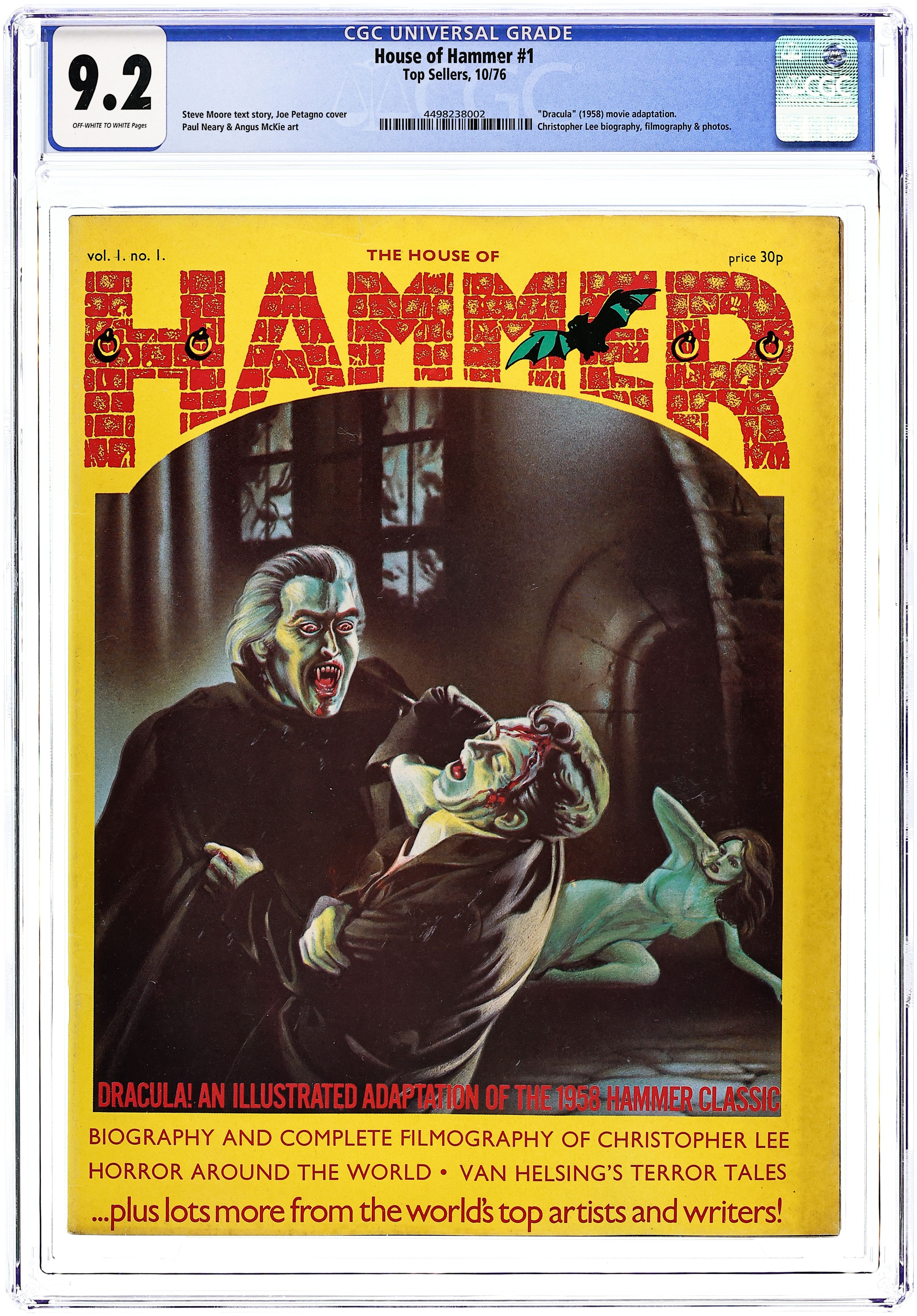 Cover by Joe Petagno. Stories by Dez Skinn, Steve Moore, John Fleming, John Brosnan, Barry Pattison, Benny Aldrich, and Tise Vahimagi. Art by Paul Neary, Ian Gibson, and Angus McKie. Edited by Dez Skinn of Warrior fame, House of Hammer presented comics adaptations and articles based on Hammer Films' legendary horror movies, featuring an array of British comics talent early in their careers. The series starts off with an adaptation of Hammer's first Dracula film, from 1958. The straightforward adaptation of the Bram Stoker classic features a script by Skinn and art by future Marvel artist Paul Neary. Captain Kronos, Vampire Hunter returns in an authorized comics sequel to the Hammer adventure film, featuring art by future Judge Dredd and Halo Jones artist Ian Gibson. In a Terror Tales short, a man raises a horde of zombies for revenge against the woman who rejected him - but he chose the wrong zombies. Plus a biography of horror-film legend Christopher Lee, a look at past movie vampires, and the history of movie special effects. NOTE: Issues #1-18 are listed under House of Hammer (1976 UK); #19 & 20 (UK edition) are listed under House of Horror (1978 Top Sellers); #20 (US Edition) and #21-30 are listed under Halls of Horror (1978). Editorial; Dracula: a Hammer Film Production; Hammer House Biography: Christopher Lee; A Filmography of Christopher Lee; Media Macabre; Captain Kronos, Vampire Hunter; Horror Around the World; Effectively Speaking; Drinkers of Blood, Stealers of Souls; Van Helsing's Terror Tales: Voodoo Vengeance. 8-in. x 10.5-in., 52 pages, B&W. Cover price $0.35.