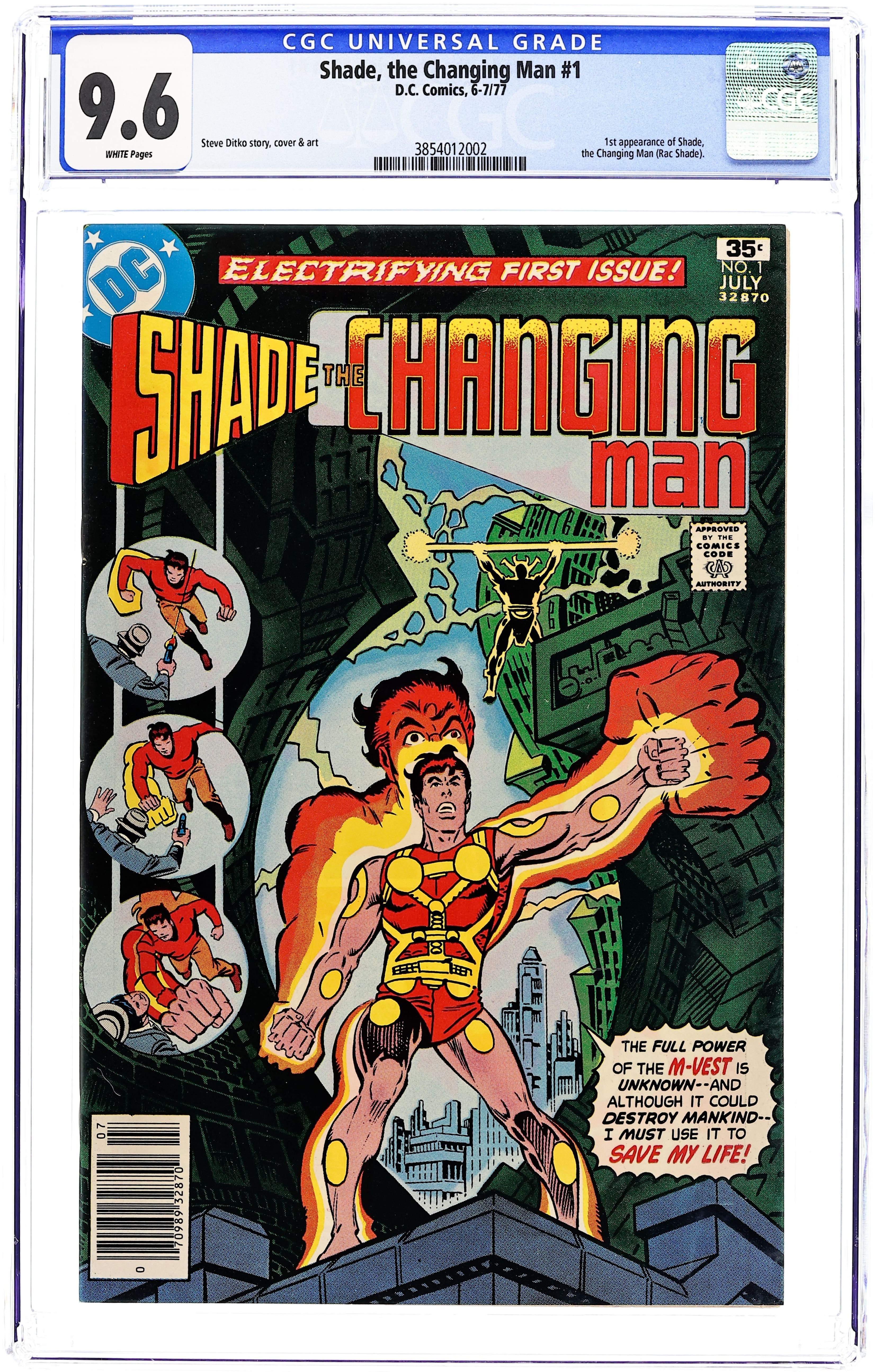 1st appearance of Shade, the Changing Man. Cover by Steve Ditko. Escape to Battleground Earth!, script by Steve Ditko and Michael Fleisher, art by Steve Ditko; Shade gets out of a prison in Meta, goes to Earth, and tries to clear his reputation—he claims innocence; With the help of his M-vest, he begins searching for Kempo; he also battles Zokag. First appearances of Mellu Loron, Crime council, The Form and Wizo. 36 pgs., full color. $0.35. Cover price $0.35.