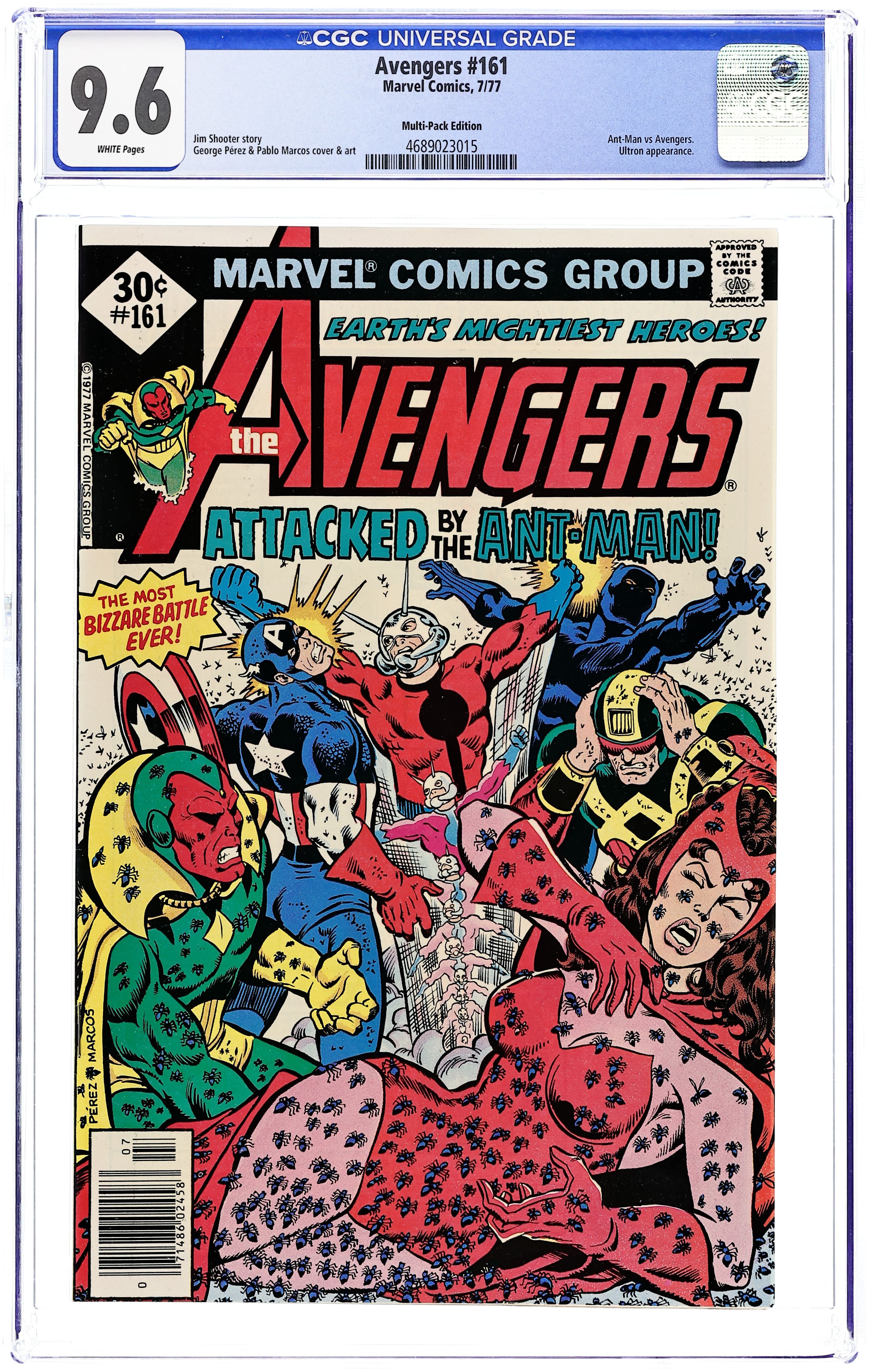 Whitman Variant. "Beware the Ant-Man!" Part 1 of 2. Script by Jim Shooter. Pencils by George Perez. Inks by Pablo Marcos. Cover by George Perez and Pablo Marcos. In incredible fashion the Avengers are attacked at their Fifth Avenue Mansion! And the assailant is none other than the Ant-Man! What in the world has happened to Hank Pym?!? Fortunately with help from the Wasp, the Avengers corral their diminutive teammate! But that only buys Earth's Mightiest Heroes a few more hours until the next attacker arrives...a certain adamantium attacker! It's a super showdown inside Avengers Mansion as eight avengers lay it all on the line against Ultron! Cameo appearances by Hawkeye and the Two-Gun Kid. Avengers Lineup: Beast, Black Panther, Captain America, Iron Man, Scarlet Witch, Vision, Wasp, and Wonder Man. (Notes: Ultron previously appeared in Fantastic Four 150. A 35-cent cover price variant exists for this issue.) Cover price $0.30.