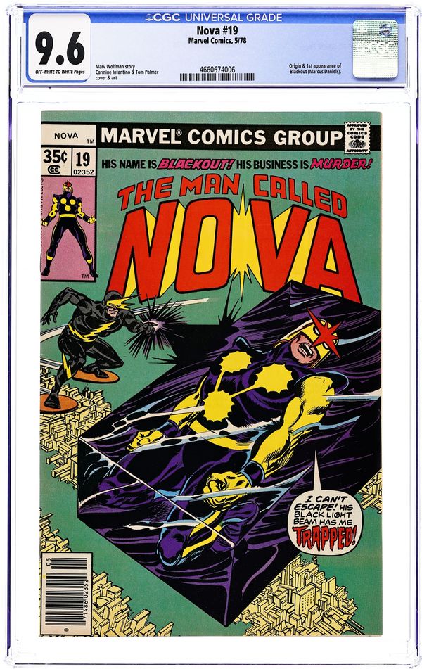 "Blackout means Business, and his Business is Murder!" Story by Marv Wolfman. Art by Carmine Infantino and Tom Palmer. As Nova patrols the skyways he is attacked by the murderous man known as Blackout. Can the Human Rocket penetrate the villains black light beam and end his rampage before Blackout murders again? 32 pages. Cover price $0.35.