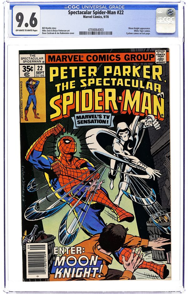 "By the Light of the Silvery Moon Knight!" Part 1 of 2. Guest-starring Moon Knight. Script by Bill Mantlo. Pencils by Mike Zeck. Inks by Bruce Patterson. Cover by Dave Cockrum and Joe Rubinstein. Moon Knight is waging a one-man war against the Maggia! During a hold-up at a local diner, he receives some unwanted help from the Amazing Spider-Man. Are the two heroes going to fight the Maggia or each other? The Maggia doesn't care, because they've imported a super-villain to beat both of them! Cameo appearances by the White Tiger and the Cyclone. (Note: This issue features the first meeting between Moon Knight and Spider-Man.) 32 pages Cover price $0.35.