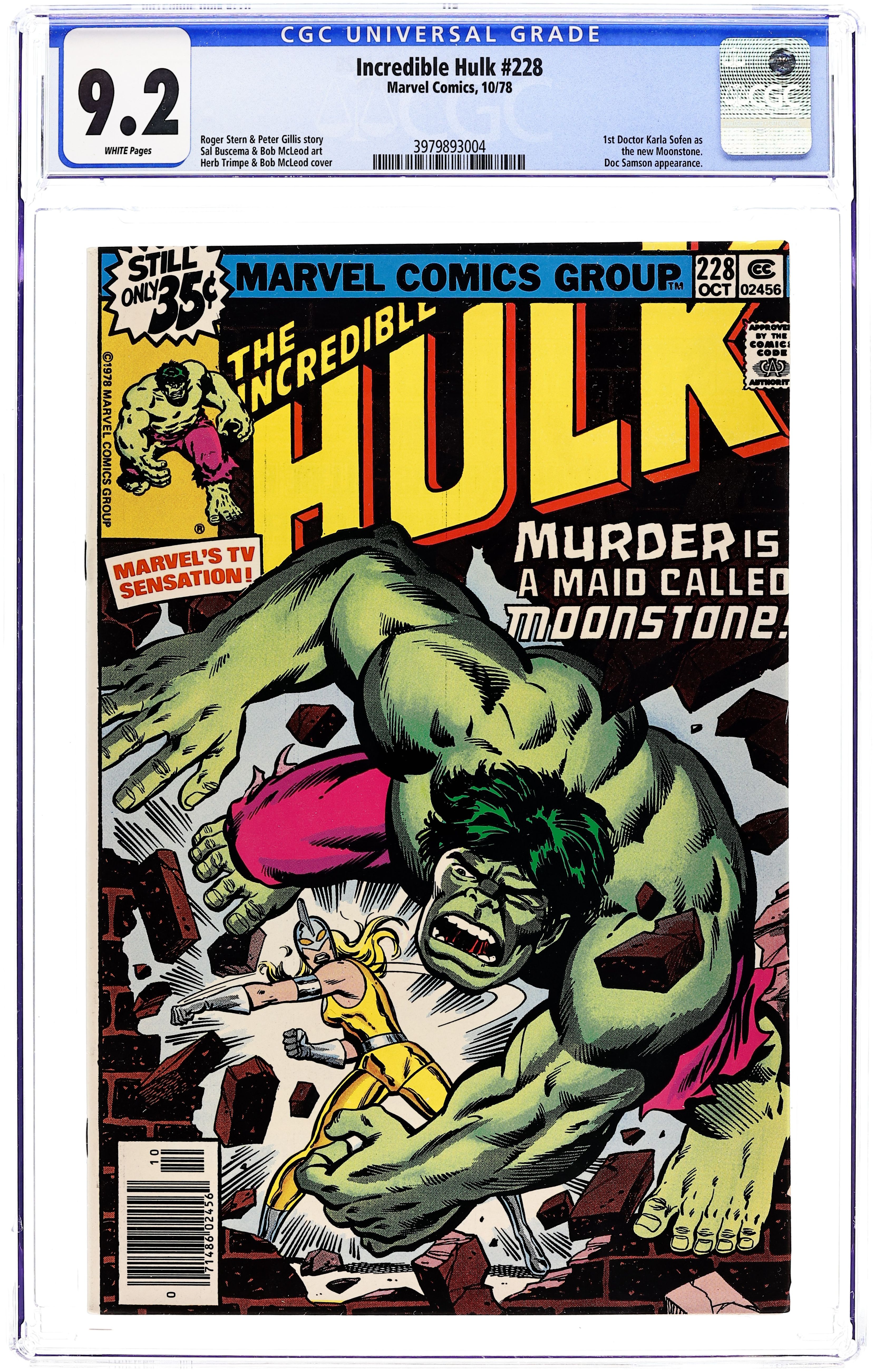 First appearance of Dr. Karla Sofen as Moonstone in "Bad Moon on the Rise!" Part 1 of 2. Script by Roger Stern and Peter Gillis. Art by Sal Buscema (breakdowns) and Bob McLeod (finishes). Cover by Herb Trimpe and Bob McLeod. At Gamma Base in the Desert Southwest, Doc Samson continues hiswork to find a way to cure the Hulk. And during a break in his research, he receives a phone call from a fellow psychiatrist named Dr. Karla Sofen. She would like to come to Gamma Base and assist with treating the Hulk. Oh, hownice! Doc Samson welcomes her with open arms, but he's not aware of her true intentions. Dr. Sofen is actually there to steal components of theGammavator for the criminal enterprise known as the Corporation. Once Karla completes her evening heist, she thinks she's home free! But on her way out of the storage vault, she runs into the Green Goliath! And then and there,the new Moonstone faces off with her first superhero -- none other than the Incredible Hulk! Cameo appearances by Betty Ross, Kropotkin, Clay Quartermain, General Thunderbolt Ross, and Jim Wilson. (Notes: Dr. Karla Sofen first appeared in Captain America 192. She is the second Moonstone after stealing the alien gemstone from the first Moonstone aka Lloyd Bloch.) 36 pages. Cover price $0.35.