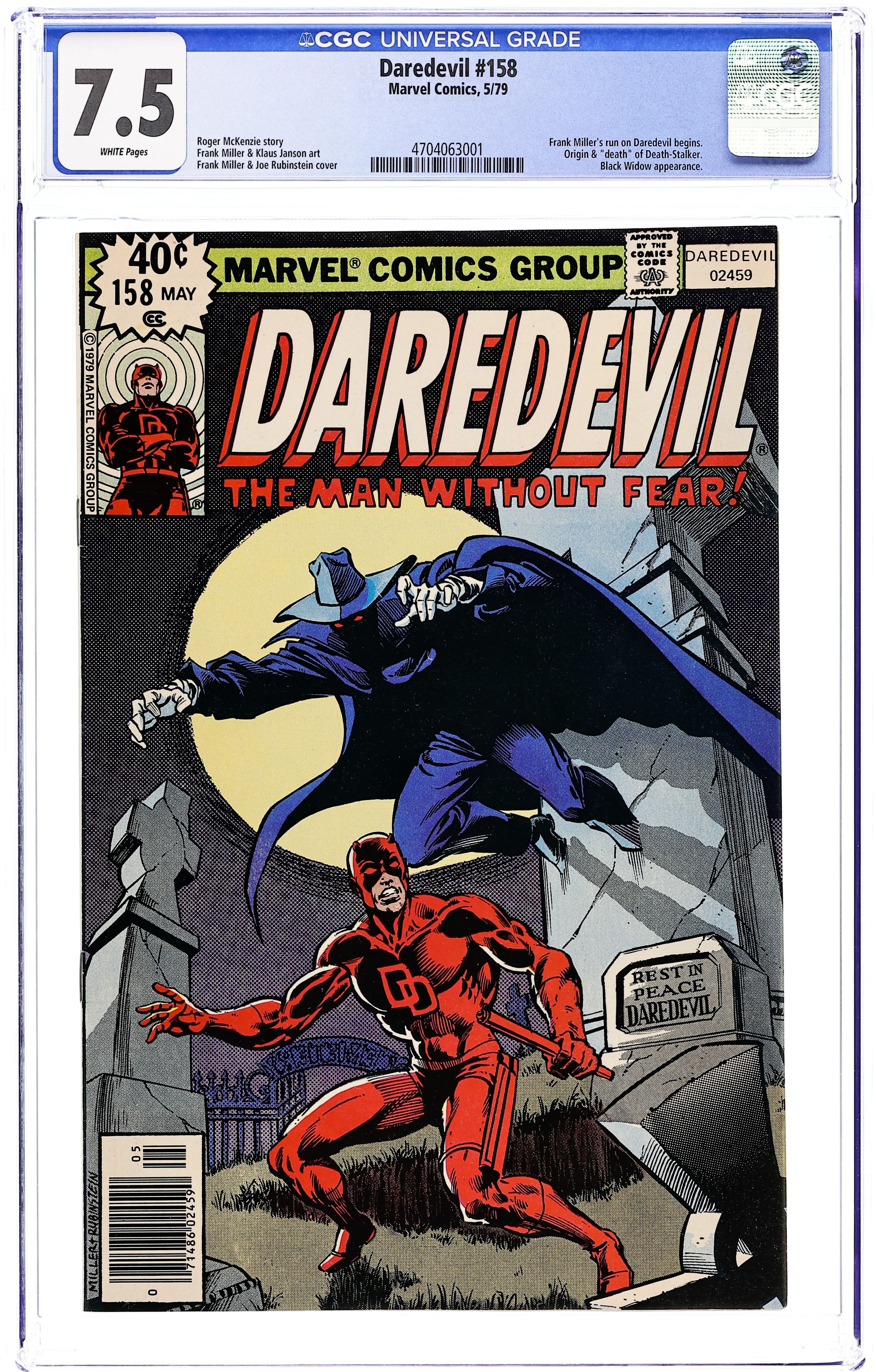 First Frank Miller Daredevil. First 40-cent cover price. Cover pencils by Frank Miller, inks by Joe Rubinstein. A Grave Mistake!, script by Roger McKenzie (Death-Stalker origin on page 7 plotted by Marv Wolfman), pencils by Frank Miller , inks by Klaus Janson.; Matt is captured by the Ani-Men and has a final showdown with Death-Stalker in a graveyard; the Unholy Three (Ape Man, Bird Man, Cat Man) appear. This issue contains a statement of ownership--average print run 393,978; average paid circulation 111.559. Miller/Joe Rubinstein cover. 36 pgs. Cover price $0.40. Cover price $0.40.