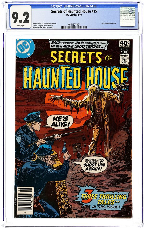 Featuring: 1 page Destiny introductory story "Secrets of Haunted House" starring Destiny, Cain and Abel, drawn by Romeo Tanghal; 6 page story "Over Your Own Dead Body" written by Carl Wessler and drawn by Tenny Henson; 1 page filler "Haunted Humor" by Dave Manak; 2 page story "An Eye for an Eye" written by Bill Dennehy and drawn by Tenny Henson & Fred Carrillo; 7 page Tales of Destiny story "Curtain Call" written by Mike W. Barr and drawn by Jess Jodloman. Cover by Luis Dominguez. Cover price $0.40.