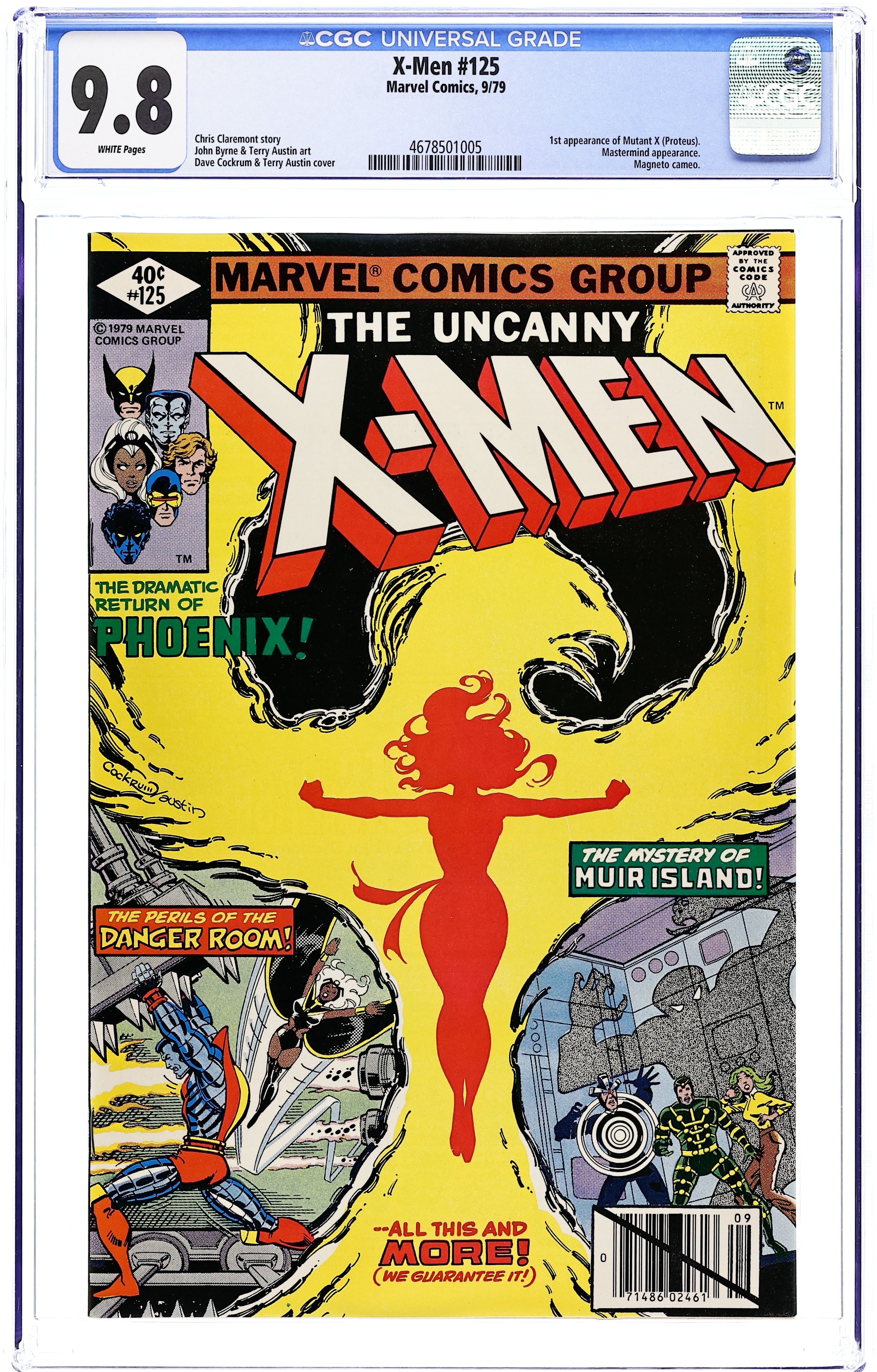 Newsstand Edition. As the cover says: the dramatic return of Phoenix! "There's Something Awful on Muir Island!" "...!" Story by Chris Claremont and John Byrne. Art by John Byrne and Terry Austin. First appearance of Mutant X (Proteus). Cover price $0.40.
