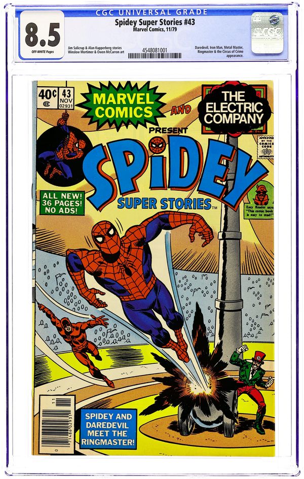 "Spidey meets Daredevil!" Guest-starring Daredevil. Story by Jim Salicrup and Alan Kupperberg. Art by Winslow Mortimer, Ricardo Villamonte, and Owen McCarron. Spidey and the Man without Fear take on the Ringmaster from the Circus of Crime. Includes the 1-page features "Daredevil the Man without Fear," "Tony Stark is Iron Man,"and "Wit of the Webslinger." Includes the back-up tale "Flight of the Human Kite!" Guest-starring the cast of the Electric Company. Plus, Spidey and the golden Avenger, Iron Man, try to save the car show in "Auto Show 1979!" Featuring the clip and collect Spidey Stamp: #27 Daredevil. Cover price $0.40.