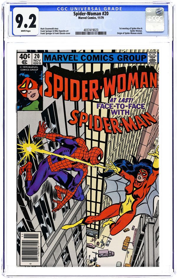 Newsstand Edition. Cover pencils by Frank Springer, inks by Frank Giacoia. Tangled Webs, script by Mark Gruenwald and Steven Grant ("co-scenario"), pencils by Frank Springer, inks by Mike Esposito; Spider-Woman finally faces Spider-Man. 36 pgs. $0.40. Cover price $0.40.