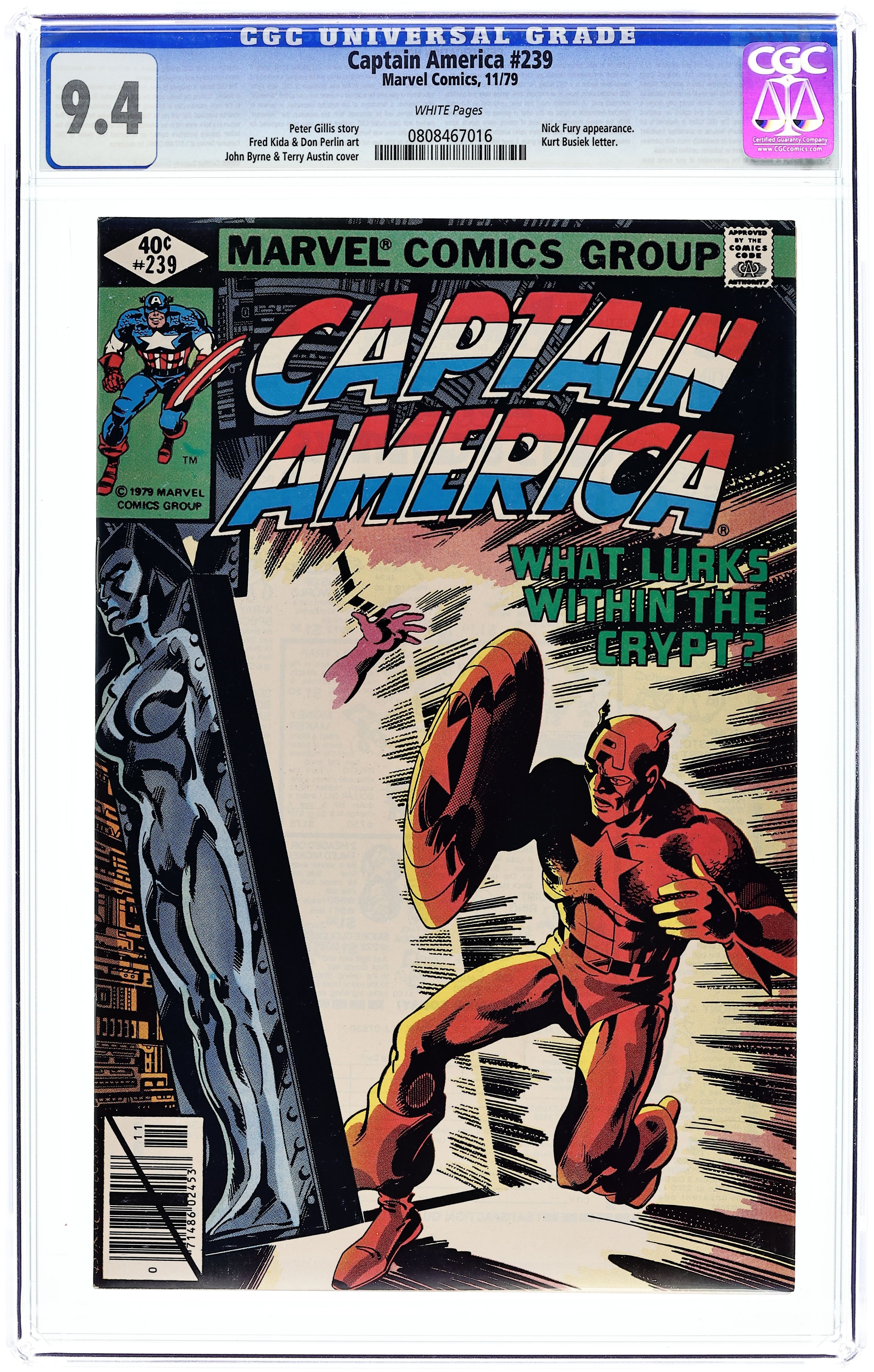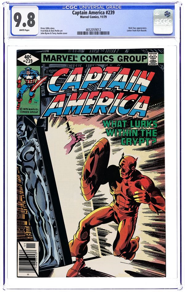 Direct Edition. "Mind-Stains on the Virgin Snow!" Part 2 of 2. Script by Peter Gillis. Pencils by Fred Kida. Inks by Don Perlin. Cover by John Byrne and Terry Austin. Inside the Dovecote citadel, the Sentinel of Liberty fights through one illusion after another to reach the captive Snowfall. However, before Cap can free her, he must deal with her captor: the Mind-Master! Will the shield-slinger defeat the Mind-Master...and discover the startling secret of Snowfall? Flashback cameo by the Sub-Mariner to recap his battle vs. the Mind-Master in Sub-Mariner (1st series) #43. (Note: The letters page includes a letter from comics writer Kurt Busiek.) 36 pages. Cover price $0.40.
