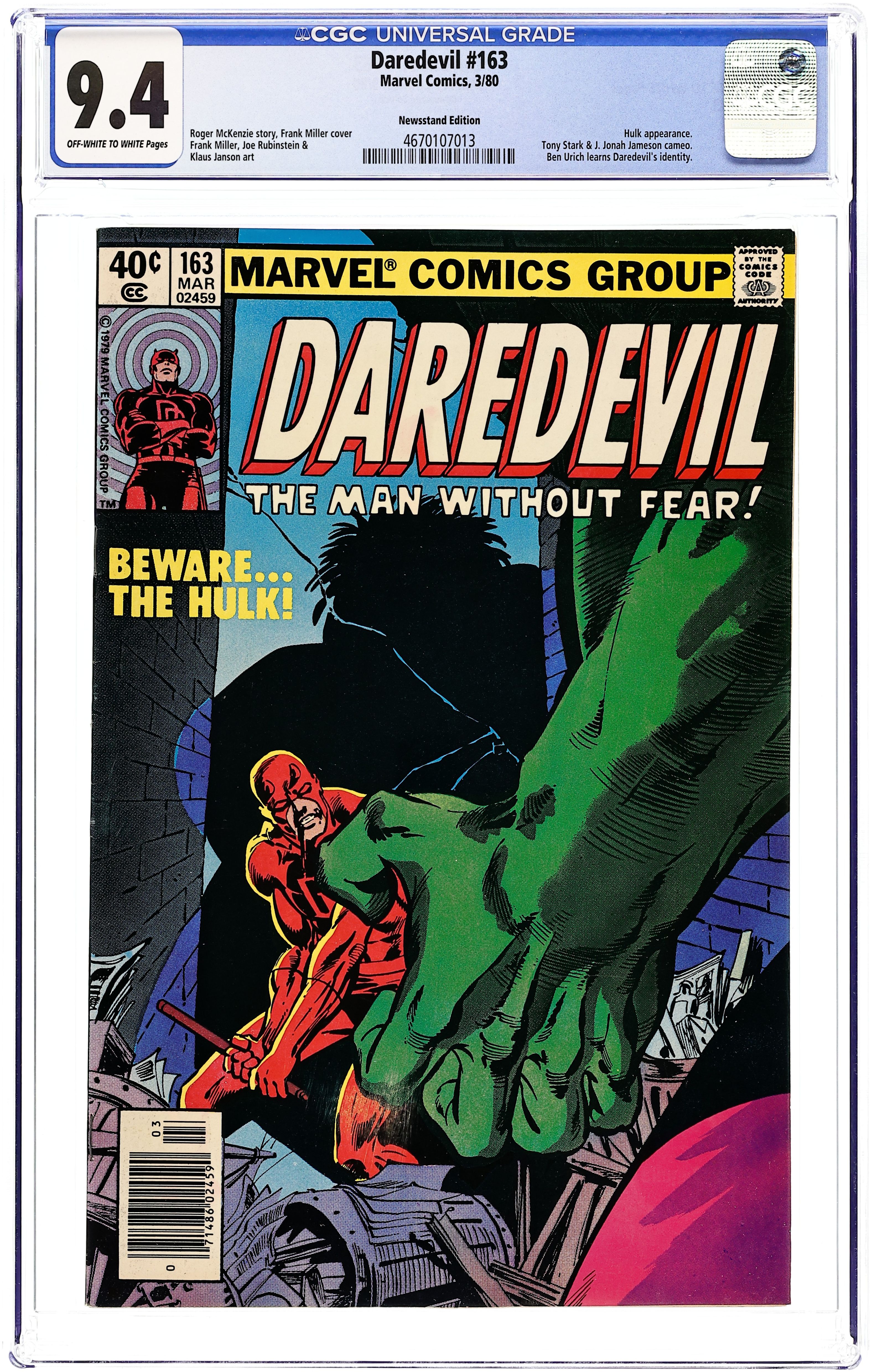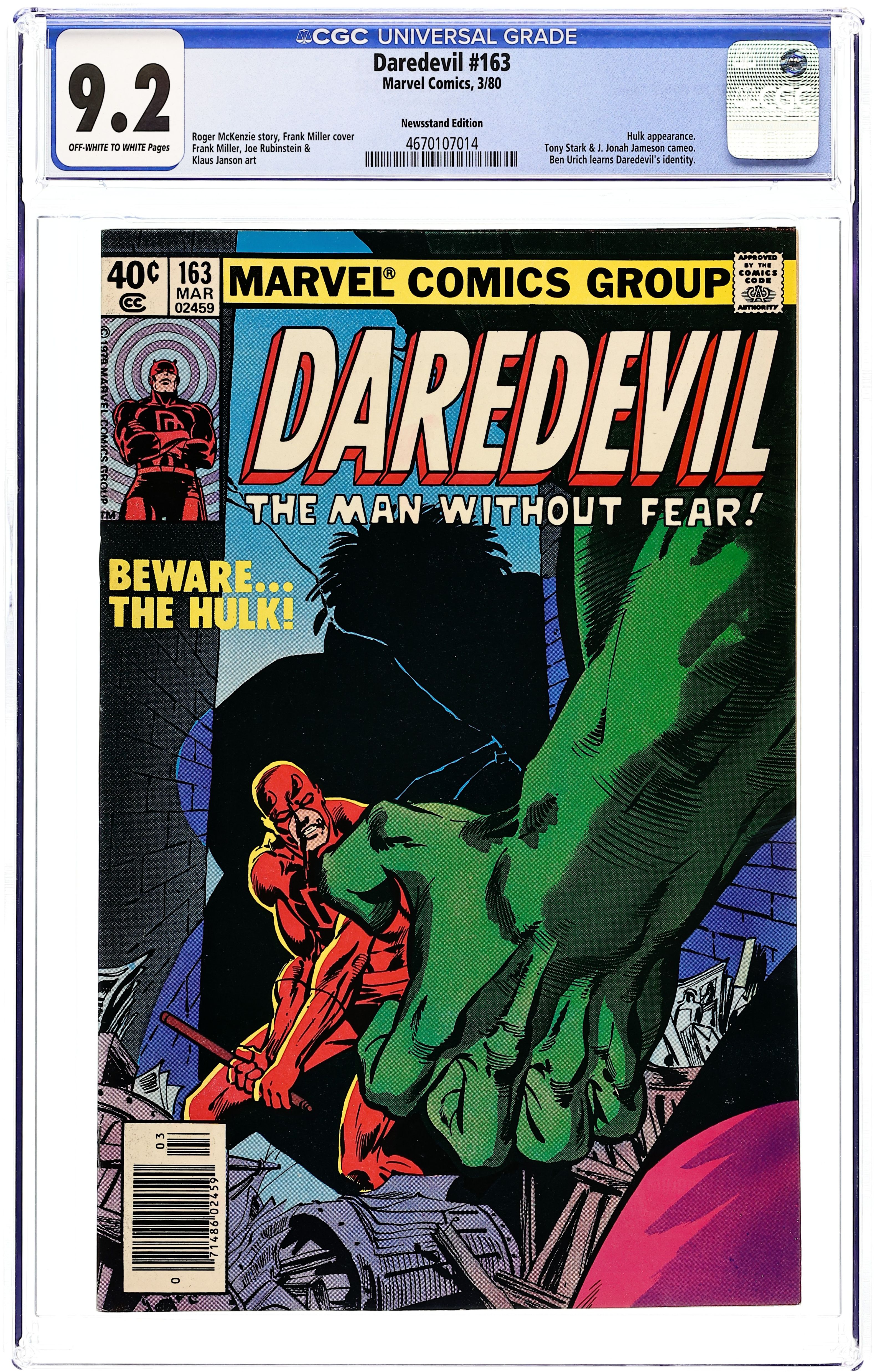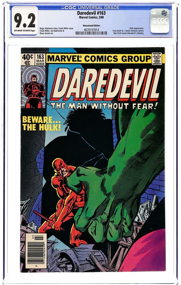 Newsstand Edition. Cover pencils by Frank Miller, inks by Joe Rubinstein. Blind Alley, script by Roger McKenzie, pencils by Frank Miller, inks by Klaus Janson (pages 1-2) and Joe Rubinstein (pages 3-18); DD tries to help Bruce Banner out and gets himself badly beaten by the Hulk for his trouble; Ben hears Heather call DD "Matt" during the battle; appearances by Tony Stark (Iron Man) and J. Jonah Jameson. Cover price $0.40.