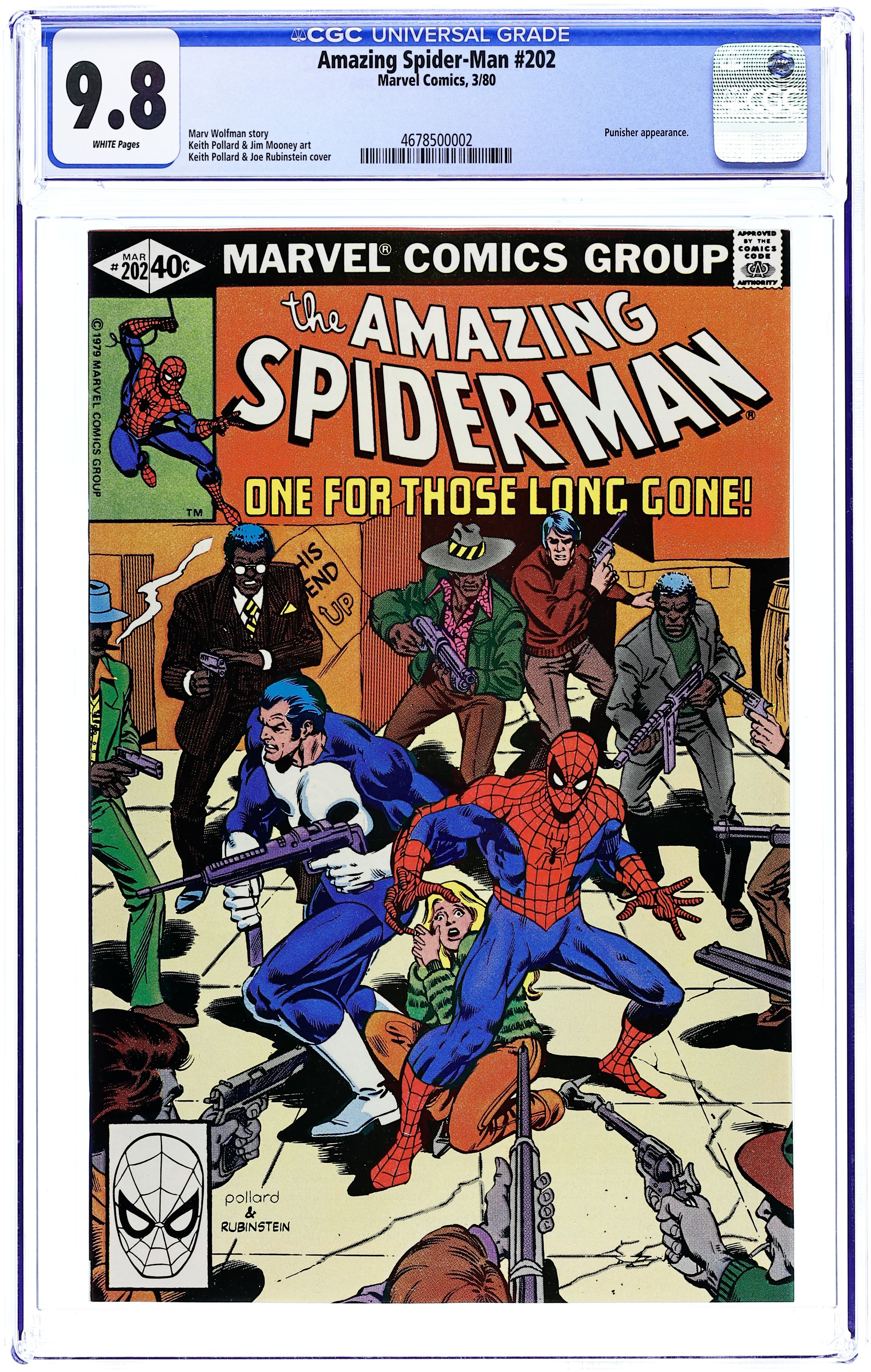 Newsstand Edition. "One for Those Long Gone!" Part 2 of 2. Guest-starring the Punisher. Script by Marv Wolfman. Art by Keith Pollard (breakdowns) and Jim Mooney (finishes). Cover by Keith Pollard and Joe Rubinstein. After surviving his nervous encounter with the Punisher, Peter Parker slips on his red and blue costume and joins the gun-toting vigilante's pursuit of the drug lords! Spider-Man wants to capture them. The Punisher wants to kill them. Something has got to give! Will the superhero or the anti-hero win the battle of wills? Cameo appearances by J. Jonah Jameson, Joe Robertson, and Dr. Jonas Harrow. (Notes: Spider-Man and the Punisher tangle again in Amazing Spider-Man Annual 15. This issue includes a sideways full-page ad featuring Batroc the Leaper promoting Crazy Magazine. This story was reprinted in Marvel Tales 219.) 36 pages Cover price $0.40.
