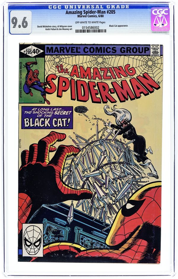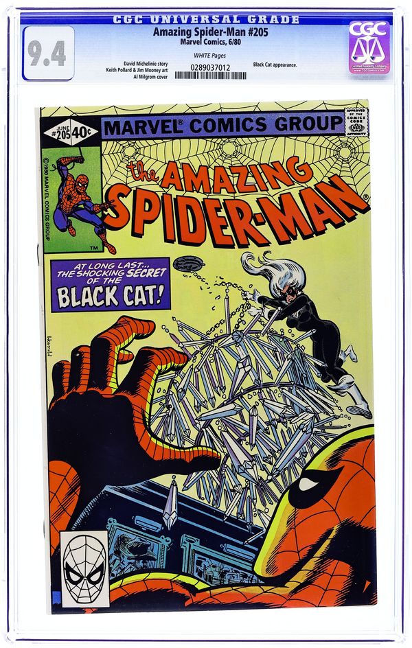 Direct Edition. "...In Love and War!" Part 2 of 2. Script by David Michelinie. Pencils by Keith Pollard. Inks by Jim Mooney. Cover by Al Milgrom. The crafty Black Cat continues to elude the wondrous wall-crawler! So far Felicia has collected two of the four romantic artifacts she seeks! However, it will be much more difficult to grab the last two with a certain web-slinging superhero poised to stop her! At an east side estate, the cat steals her final prize! But the amazing one follows her home! Will Spider-Man and Felicia finally resolve their differences? A surprise ending with a tender hug! (Note: The Black Cat returns in Amazing Spider-Man 226.) 36 pgs. Cover price $0.40.