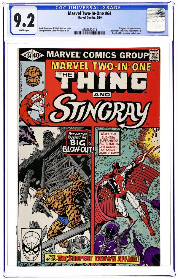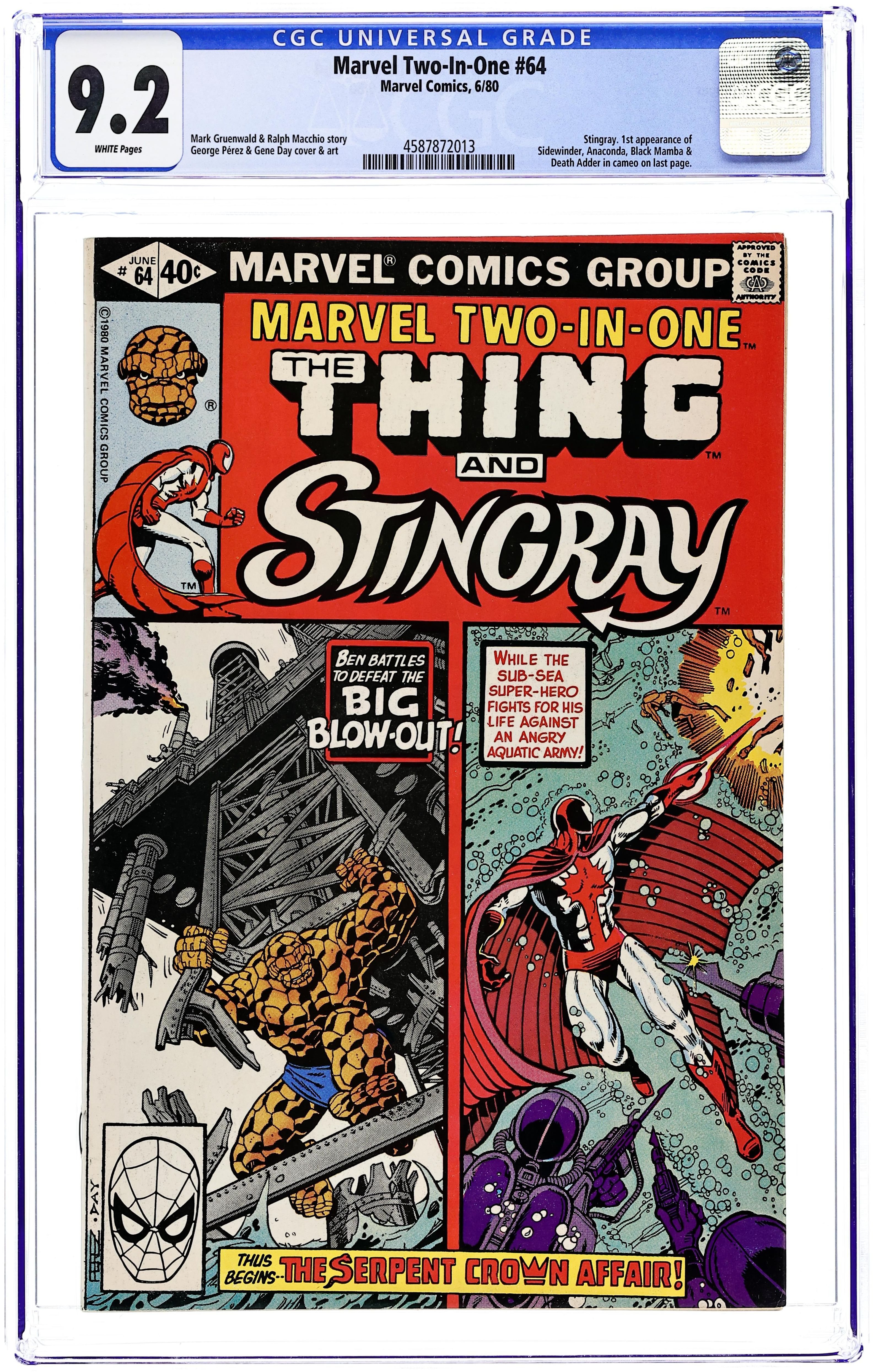 The Serpent Crown Affair Part 1 of 3. "Big Blowout!" Guest-starring Stingray. Story by Mark Gruenwald and Ralph Macchio. Art by George Perez and Gene Day. The marine biologist/super-hero Stingray joins the Idol of Millions in an epic struggle for one of the most ancient and evil artifacts in Marvel's history, the Serpent Crown. And, the sinister Serpent Squad shows up to ruin our heroes' day. 32 pages. Cover price $0.40.