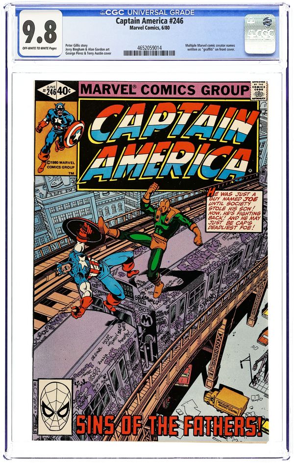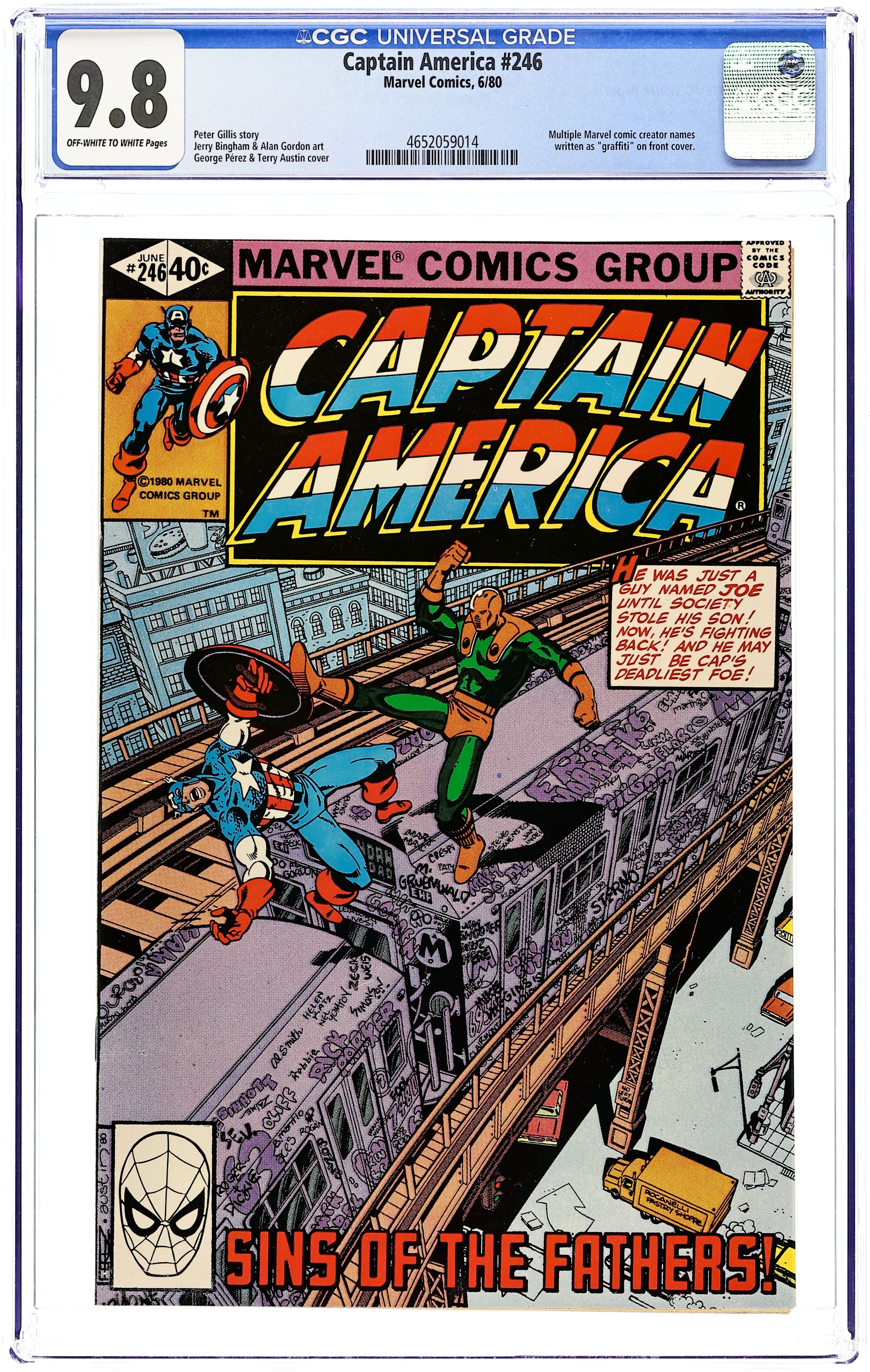 Direct Edition. "The Sins of the Fathers!" Script by Peter Gillis. Pencils by Jerry Bingham. Inks by Alan Gordon. Cover by George Pérez and Terry Austin. Captain America responds to a disturbance at the Foley Square Federal Building! And inside the Social Security Office on the sixth floor, Cap finds a super-powered villain named Joe. It's the same Joe that Spider-Man fought way back in Amazing Spiderman (1st series) #38. What is fueling Joe's rage? And how can the Sentinel of Liberty stop it? Cameo appearances by Kris Keating and Joshua Cooper. (Notes: Joe Smith returns years later in Amazing Spider-Man Annual #28. The graffiti on the elevated train (by cover inker Terry Austin) bears the names of many writers and artists in the comics industry.) 36 pages. Cover price $0.40.