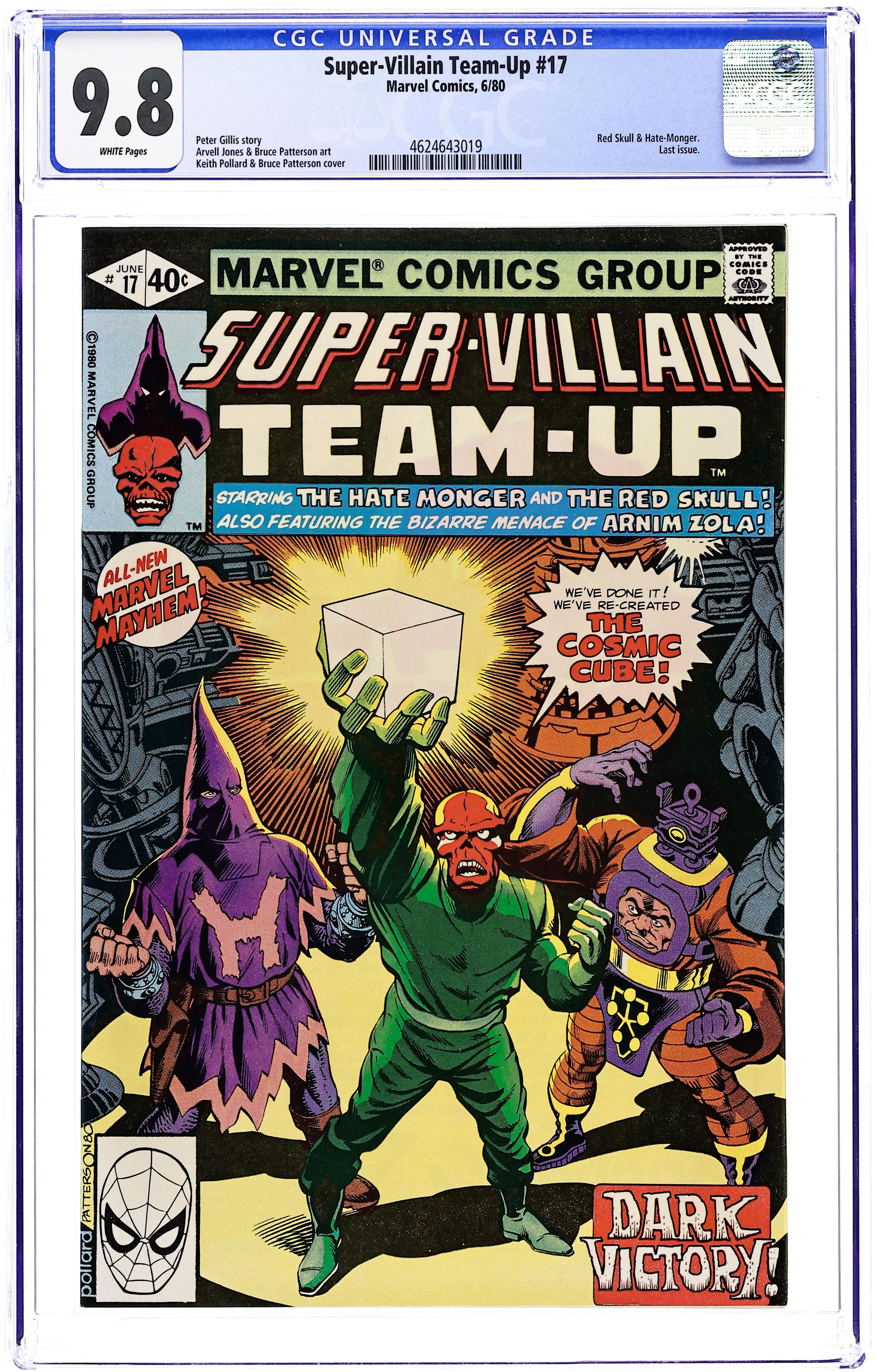 Direct Edition. Final issues of the series - "Dark Victory" Part 2 of 2. Script by Peter Gillis. Art by Arvell Jones (breakdowns) and Bruce Patterson (finishes). Cover by Keith Pollard and Bruce Patterson. Despite the best efforts of the Israeli prisoners, the Red Skull's plan to create another cosmic cube continues! The sinister skull has gathered Arnim Zola, the Hate Monger (aka Adolf Hitler incognito), and the top A.I.M. scientist to assist in constructing the cube! But unbeknownst to the Red Skull, two things are working against him! First, one of the Shin Bet commandos has escaped and alerted SHIELD! And second, the Hate Monger has his own scheme for controlling the cube! When SHIELD's fighter jets attack the skull's island base, chaos erupts! And the situation deteriorates into every man for himself! Who will end up with the cosmic cube? The Red Skull, the Hate Monger, SHIELD, or no one at all? Flashback cameos by Captain America, Captain Marvel, Drax the Destroyer, Iron Man, Modok, and Thanos to recap the history of the first cosmic cube. Flashback cameos by Toro and the original Human Torch to explain how Hitler became the Hate Monger. (Note: The Red Skull returns in Captain America 261.) 32 pages. Cover price $0.40.