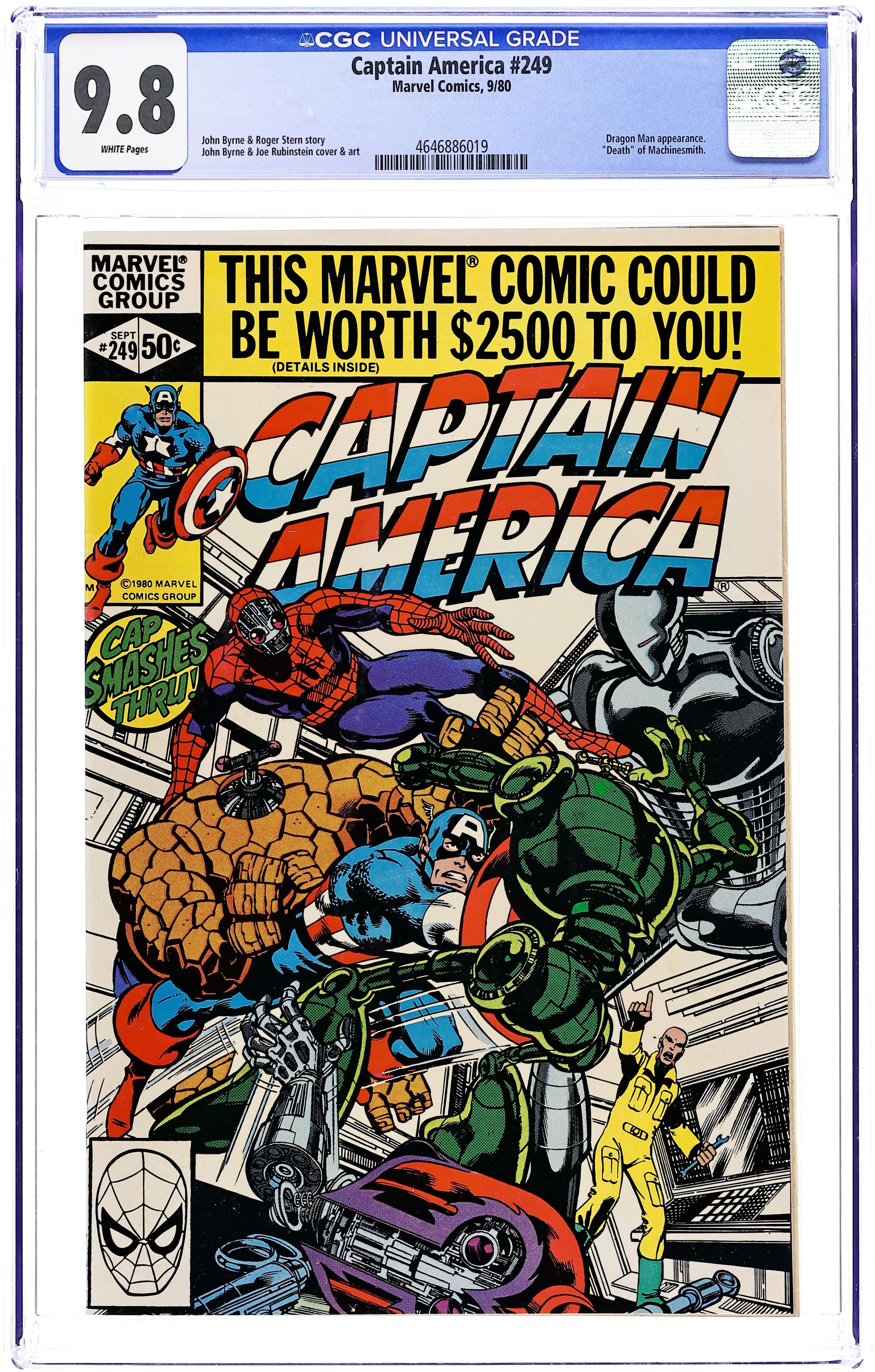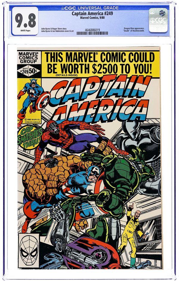 Direct Edition. "Death, Where is Thy Sting?" Part 3 of 3. Plot by Roger Stern and John Byrne. Script by Roger Stern. Pencils by John Byrne. Inks by Joe Rubinstein. Cover by John Byrne and Joe Rubinstein. The star-spangled avenger is on the ropes vs. the powerful Dragon Man! The android dragon(under the guidance of Machinesmith) tracked Steve Rogers to Brooklyn. And now Cap is desperately trying to break Machinesmith's control of his fire-breathing foe! Auspiciously, the Living Legend finds a way; and DragonMan makes a beeline back to his master's robot lair. Cap quickly follows...and his battle against all of Machinesmith's robots begins! Will the Sentinel of Liberty find a ghost in the machinesmith? Cameo appearance by Bernie Rosenthal. First 50¢ cover price. 36 pages. Cover price $0.50.
