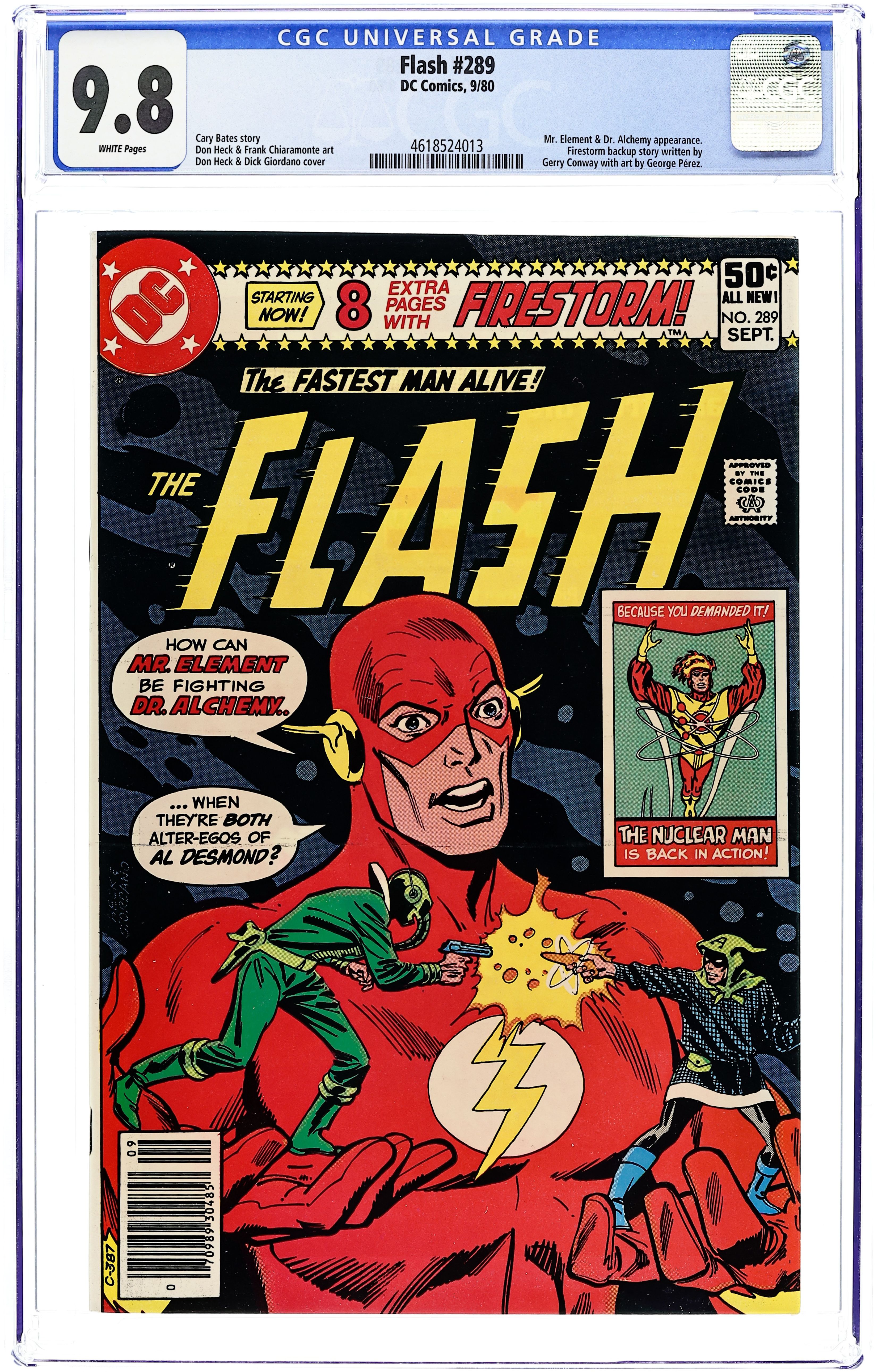 First 50-cent issue. Cover pencils by Don Heck, inks by Dick Giordano. The Good...The Bad...And The Unexpected!, script by Cary Bates, pencils by Don Heck, inks by Frank Chiaramonte; Flash battles Mr. Element and Dr. Alchemy simultaneously, even though they're supposedly the same person. Hostess Twinkies ad with Batgirl. Firestorm is Back In Town!, script by Gerry Conway, pencils by George Perez (making his DC debut), inks by Romeo Tanghal; Ronnie Raymond beginning a chat with Ronald Stein about the nature of their partnership; continued from Firestorm #5. Superman/Spider-Man team-up ad. 36 Pages, Full Color. Cover price $0.50.