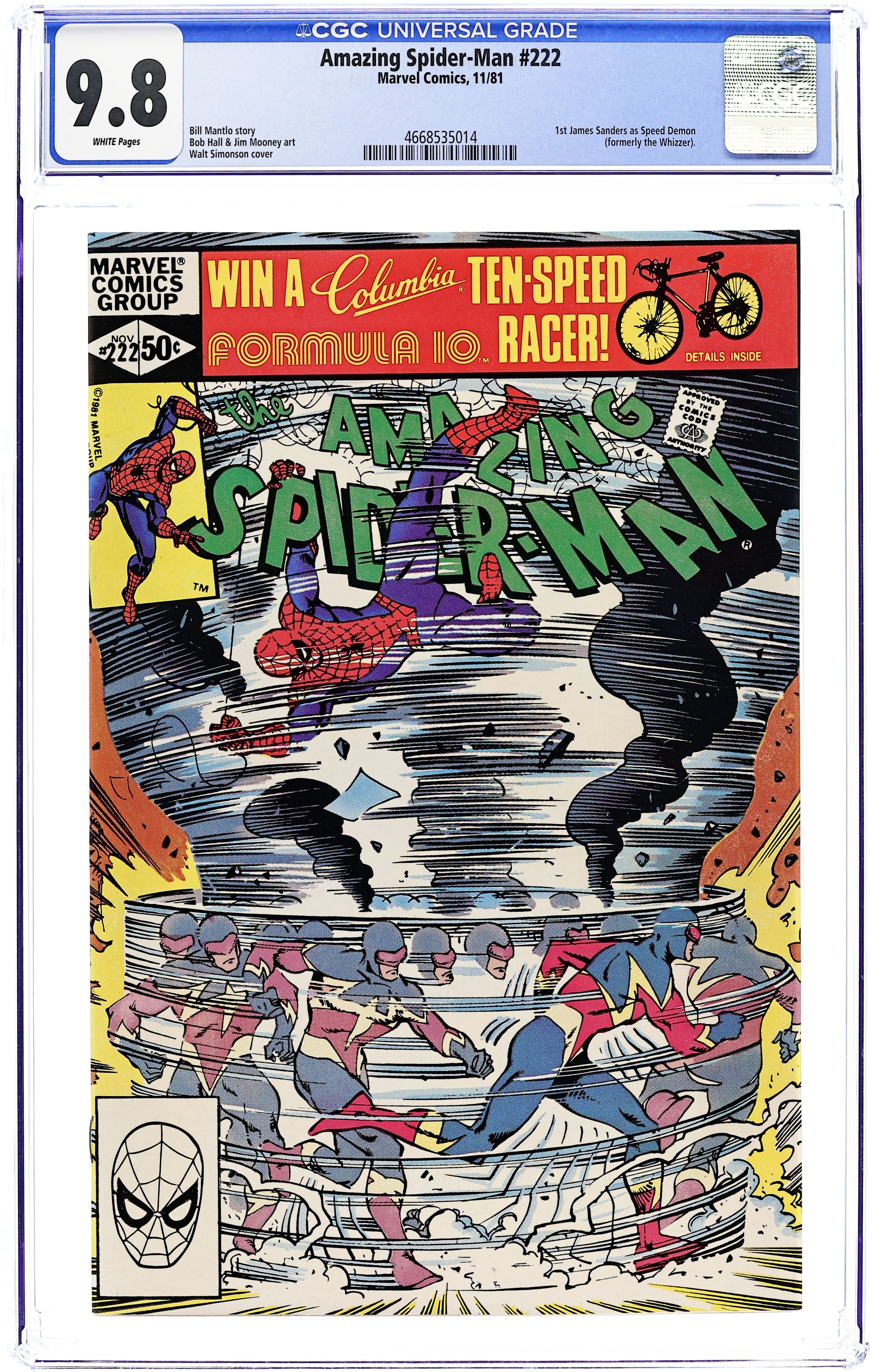 Direct Edition. "Faster than the Eye!" Script by Bill Mantlo. Pencils by Bob Hall. Inks by Jim Mooney. Cover by Walt Simonson. The new and improved Speed Demon is on the loose! And robbing various department stores left and right! But when the lightning-fast villain brags about hitting the Bloomingdale's next, your friendly neighborhood web-slinger decides to go shopping! After the Speed Demon cruises through the display counters and merchandise racks, he encounters a wall-crawling roadblock! Will the Speed Demon run through the express checkout? Or will Spider-Man cancel his order? A fun story! Cameo appearances by J. Jonah Jameson, Joe Robertson, and Lance Bannon. Flashback cameos by the Grandmaster, Thor, Goliath, and Captain America. (Notes: The Speed Demon previously appeared in Avengers Annual 8 (as the Whizzer of the Squadron Sinister). He returns in Marvel Team-Up 121. Ed Hannigan provided the cover sketch.) 36 pages. 50 cent cover price. Cover price $0.50.