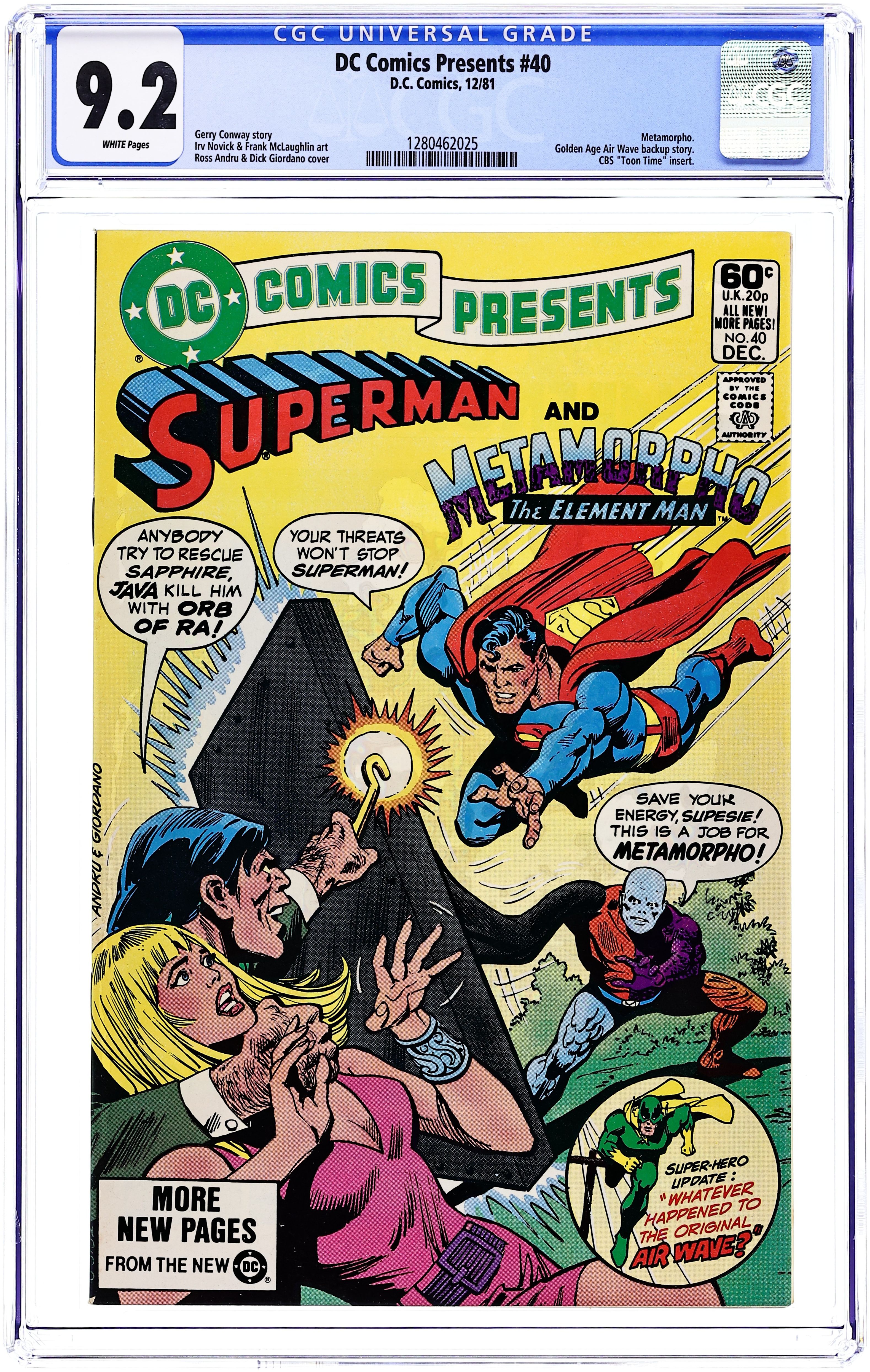 Direct Edition. Cover by Ross Andru and Dick Giordano. Stories by Gerry Conway and Bob Rozakis. Art by Irv Novick, Alex Saviuk, Frank McLaughlin and Vince Colletta. When strange and unusual incidents involving elements occur, Superman suspects that Metamorpho the Element Man may be involved in "The Day the Elements Went Wild!" by Gerry Conway, Irv Novick and Frank McLaughlin. Characters in this story: Superman; Metamorpho; Java (villain); Sapphire Stagg; Morgan Edge; Lou; Simon Stagg. Plus: Back-up story "Whatever Happened to the Original Air Wave?" by Bob Rozakis, Alex Saviuk and Vince Colletta. Characters in this story: Air Wave [Larry Jordan] (death); Joe Parsons (villain); Helen Jordan; Air Wave [Hal Jordan] (as a baby). Also: Letter from Todd McFarlane. And: The Penguin in 1-page Hostess Fruit Pies ad "Penguins on Parade" with art by Curt Swan and Vince Colletta. 36 pages, full color. Cover price $0.60.