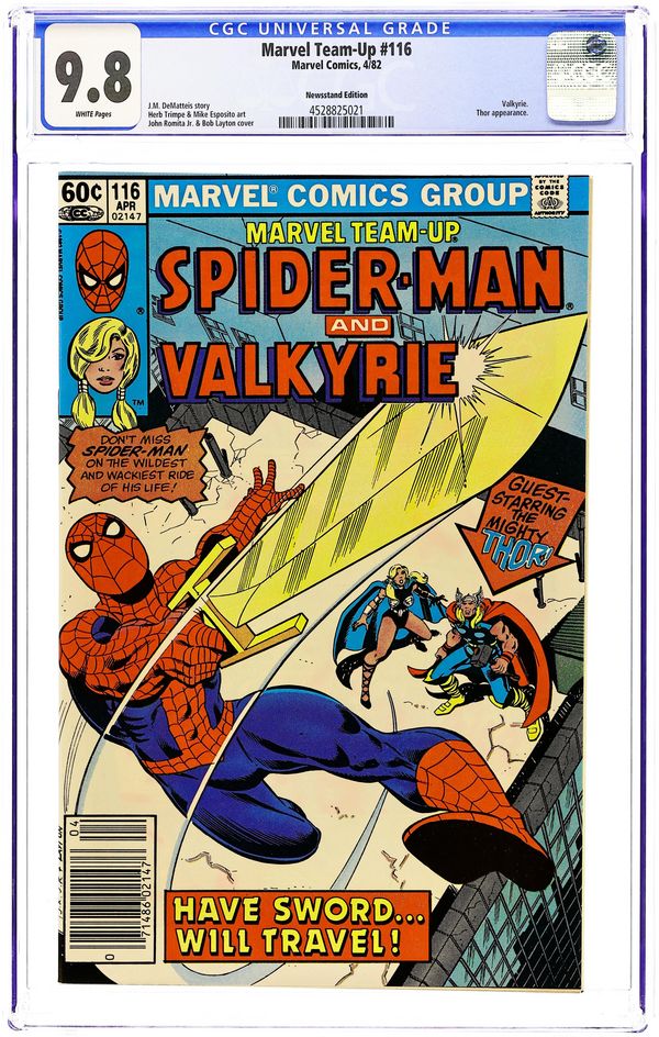 Newsstand Edition. "Between Sword and Hammer!" Part 2 of 2. Guest-starring Spider-Man, Thor, and Valkyrie. Script by J.M. DeMatteis. Art by Herb Trimpe (breakdowns) and Mike Esposito (finishes). Cover by John Romita, Jr. and Bob Layton. In a strange twist of fate last issue, Meru and Dalia merged into a glowing mass of energy! And now while looking for a human body to occupy, the past residents of Cherron find one...Valkyrie's! Are Meru and Dalia going to use Valkyrie as their instrument of revenge on Spider-Man and Thor? You bet! First, Brunhilde attacks the web-slinger, and then the thunder god! The web-slinger is ready to fight back, but the Prince of Asgard has a soft spot in his heart for Valkyrie. How is your friendly neighborhood Spider-Man going to get out of this mess? A fun story! (Notes: The letters page contains a statement of ownership: average print run 418,687; average paid circulation 185,818. This issue includes a full-page ad for Hostess Fruit Pies featuring Captain America and Nick Fury vs. the Trapster.) 36 pages. Cover price $0.60.