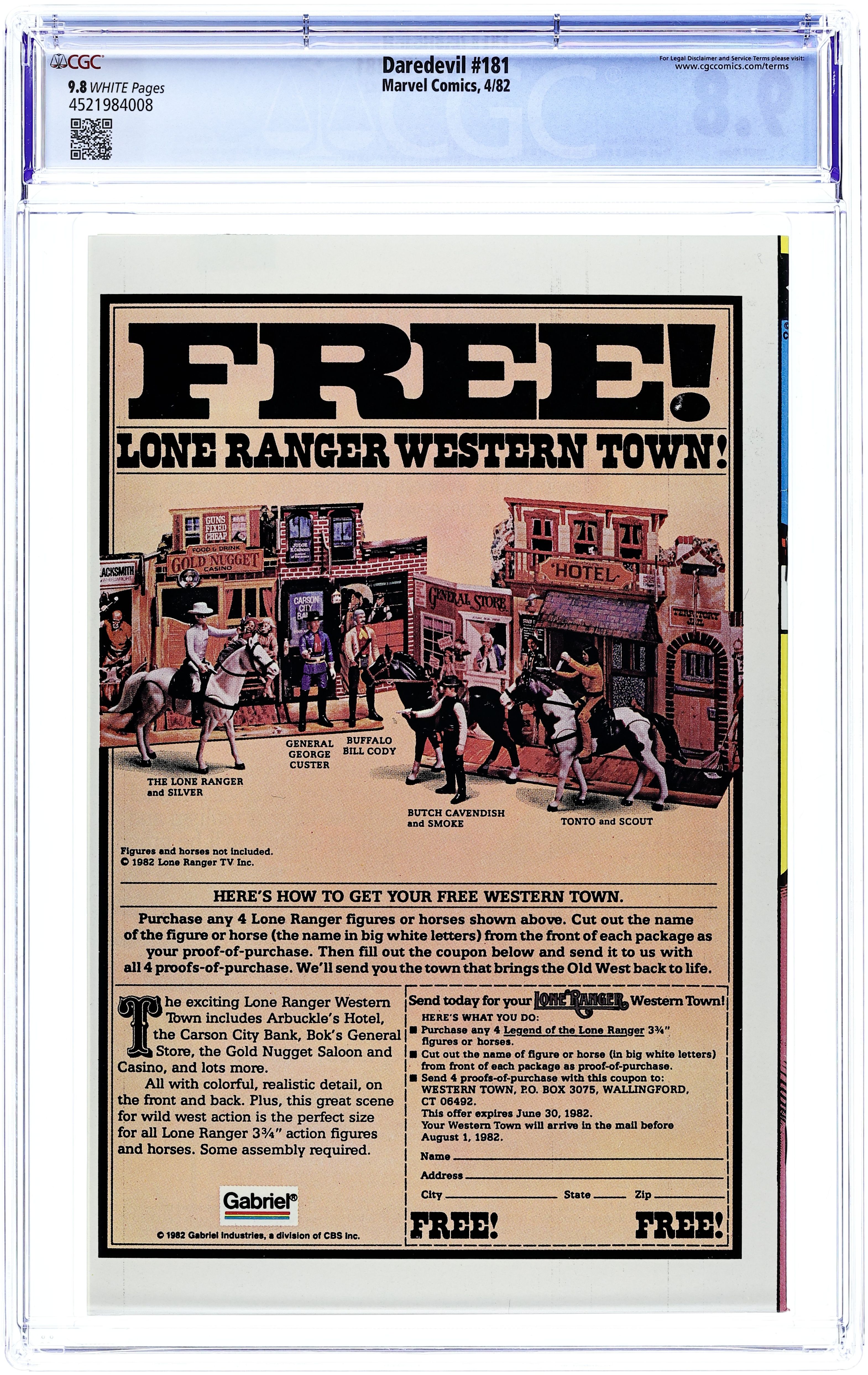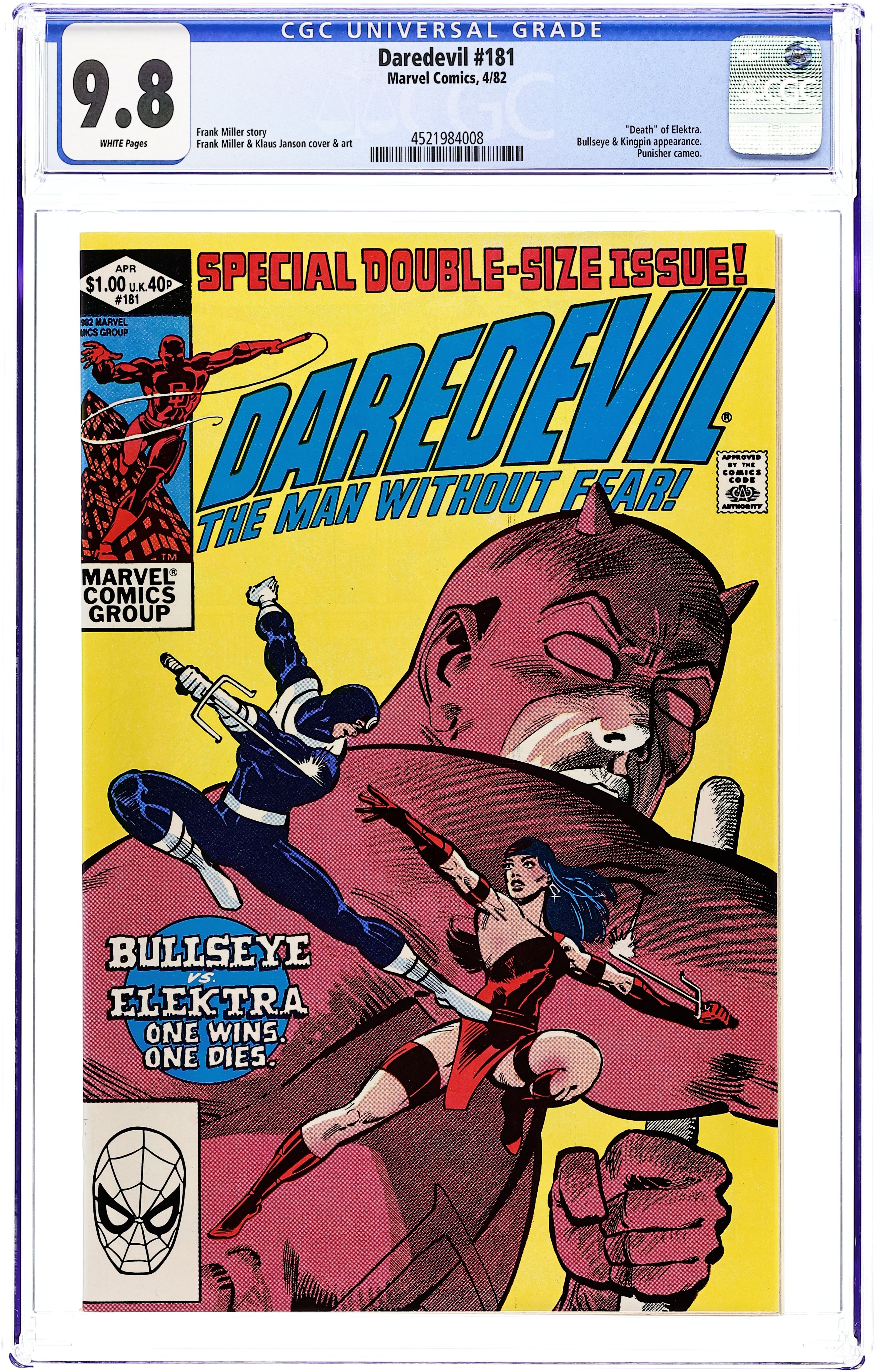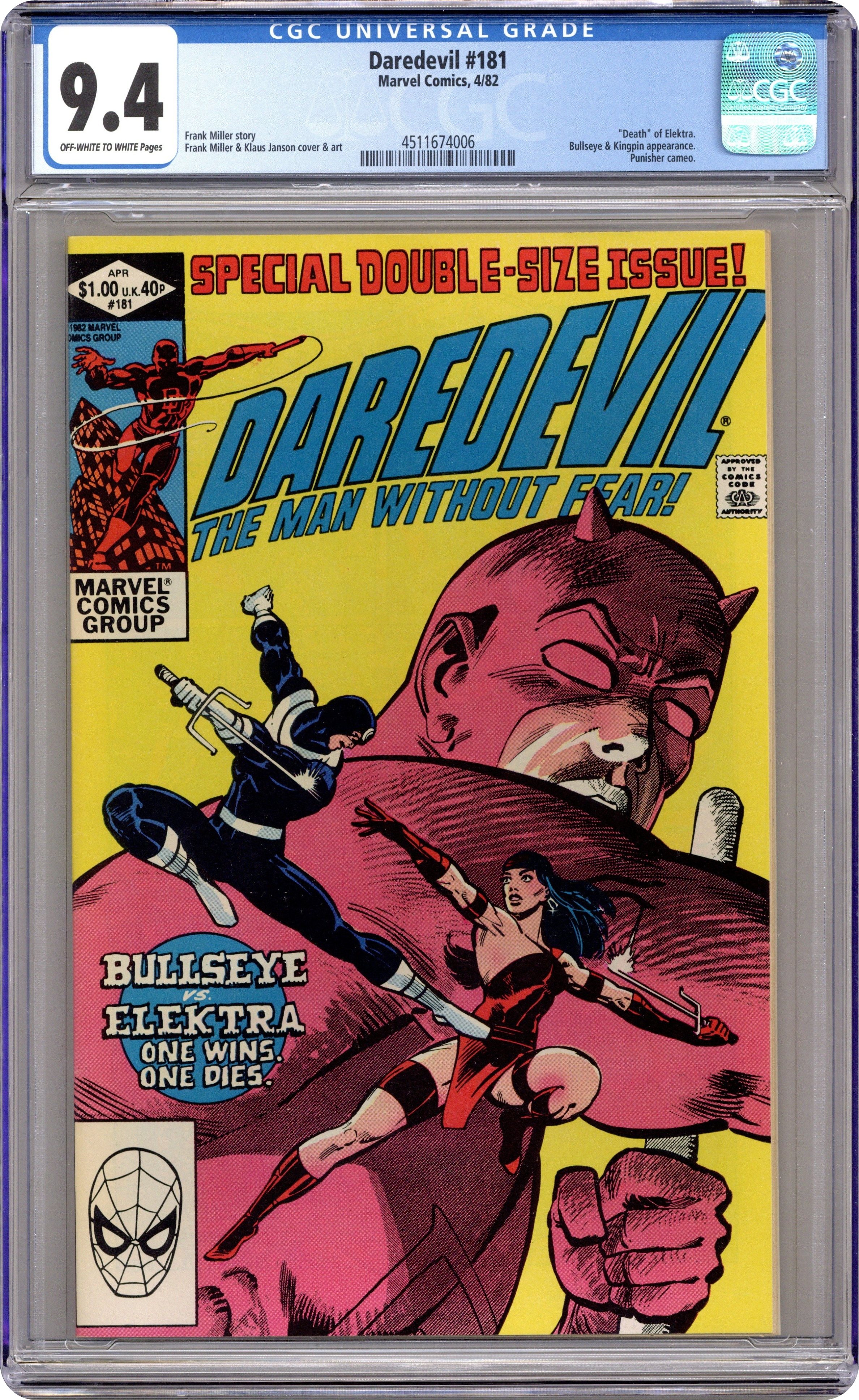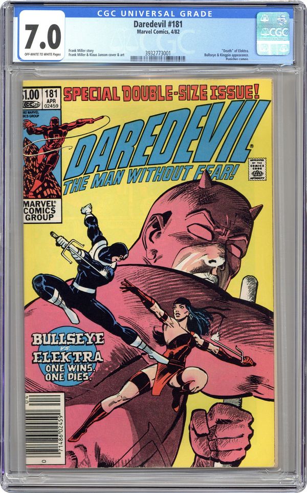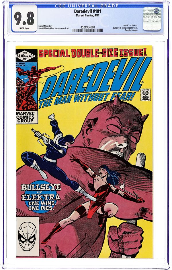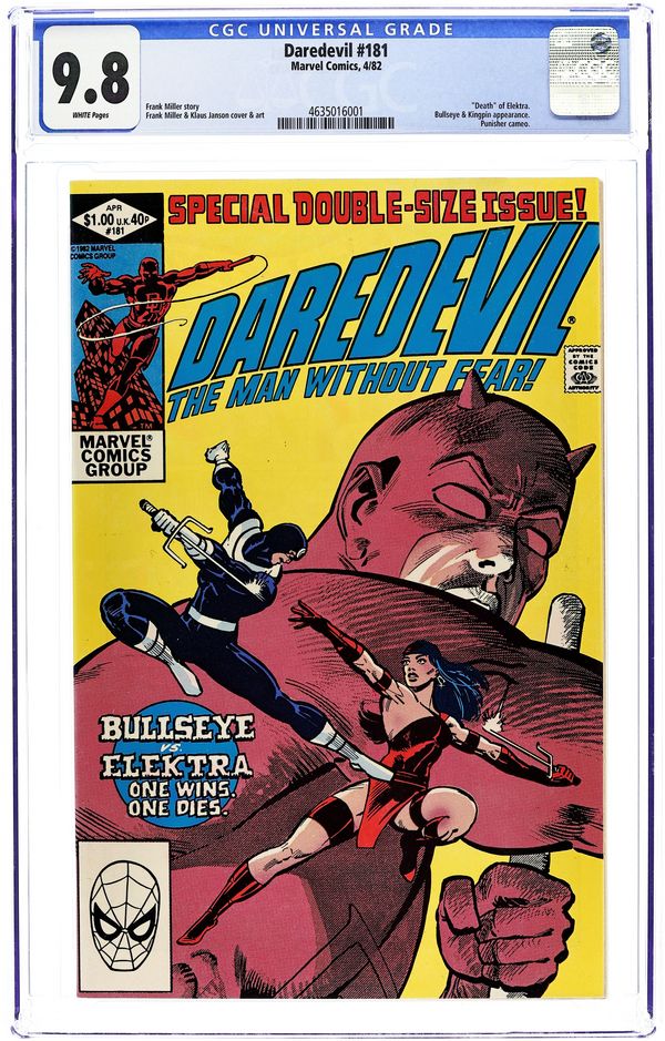 Newsstand Edition. Cover pencils by Frank Miller, inks by Klaus Janson. Last Hand, script by Frank Miller, pencils by Frank Miller (breakdowns) and Klaus Janson (finished art), inks by Klaus Janson; Bullseye breaks out of prison; Elektra hunts down Foggy and is about to kill him until she recognizes him as Matt's buddy from college; Bullseye fights Elektra and kills her with her own sai; DD goes after Bullseye and ends up dropping him from a great height, breaking every bone in his body; Kingpin appearance; story narrated by Bullseye; story dedicated to the memory of Wally Wood 1927-1981. Full page pin-up ad for Marvel Fanfare, art by Michael Golden. Statement of Ownership average # of copies in preceding 12 months: 276,812. 36 pgs. Cover price $1.00.