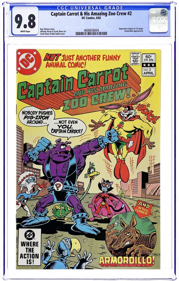 Direct Edition. Script by Roy Thomas, pencils by Alfredo Alcala, inks by Scott Shaw. Cover by Shaw and Smith. "The Macabre Menace of the Mammal Called Amordillo!" Pig Iron storms off in a huff, leaving the team for A.C.R.O.S.T.I.C. (A Corporation Recently Organized Solely to Instigate Crimes.) Cover price $0.60.