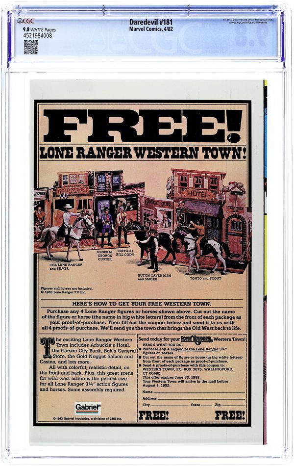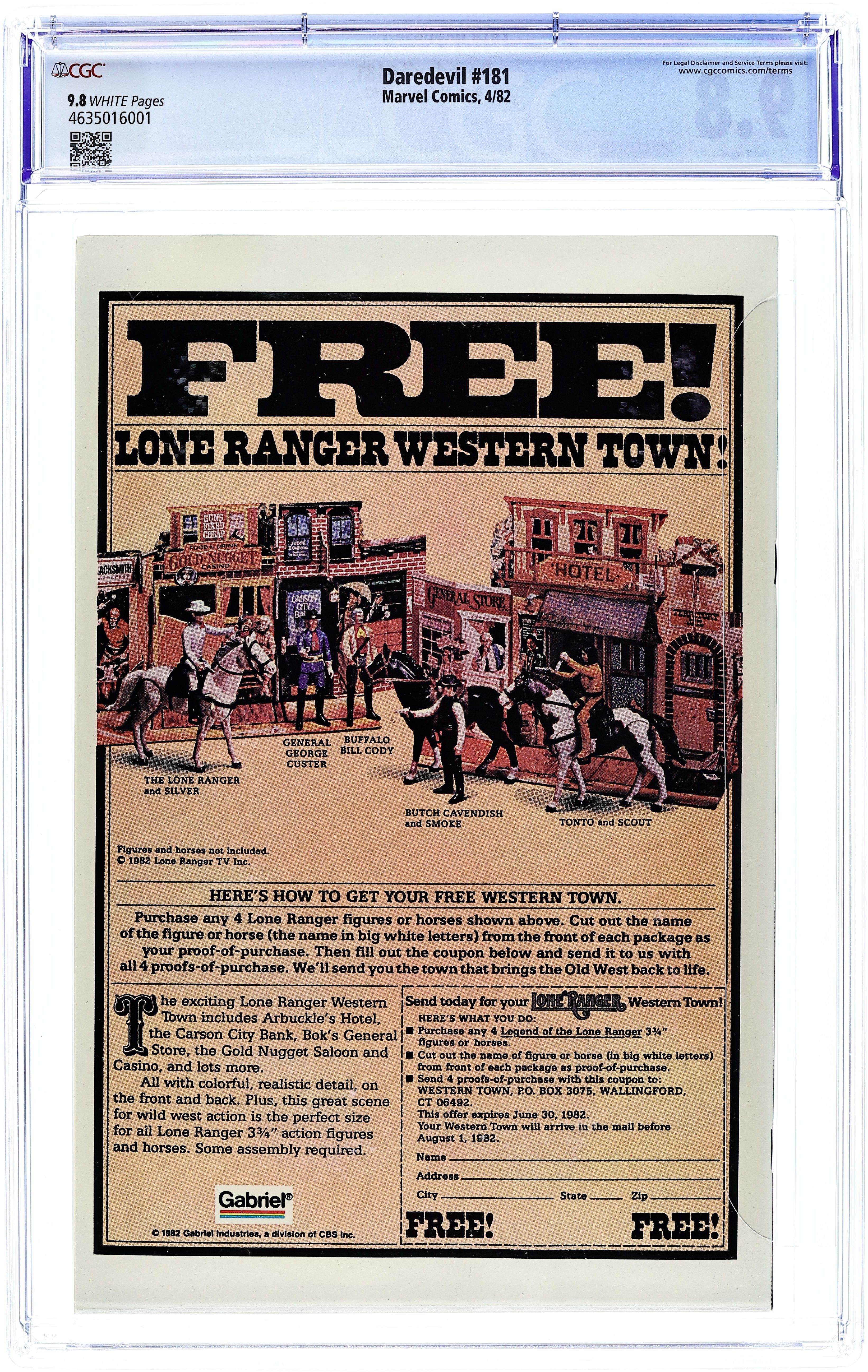 Direct Edition. Cover pencils by Frank Miller, inks by Klaus Janson. Last Hand, script by Frank Miller, pencils by Frank Miller (breakdowns) and Klaus Janson (finished art), inks by Klaus Janson; Bullseye breaks out of prison; Elektra hunts down Foggy and is about to kill him until she recognizes him as Matt's buddy from college; Bullseye fights Elektra and kills her with her own sai; DD goes after Bullseye and ends up dropping him from a great height, breaking every bone in his body; Kingpin appearance; story narrated by Bullseye; story dedicated to the memory of Wally Wood 1927-1981. Full page pin-up ad for Marvel Fanfare, art by Michael Golden. Statement of Ownership average # of copies in preceding 12 months: 276,812 Cover price $1.00.