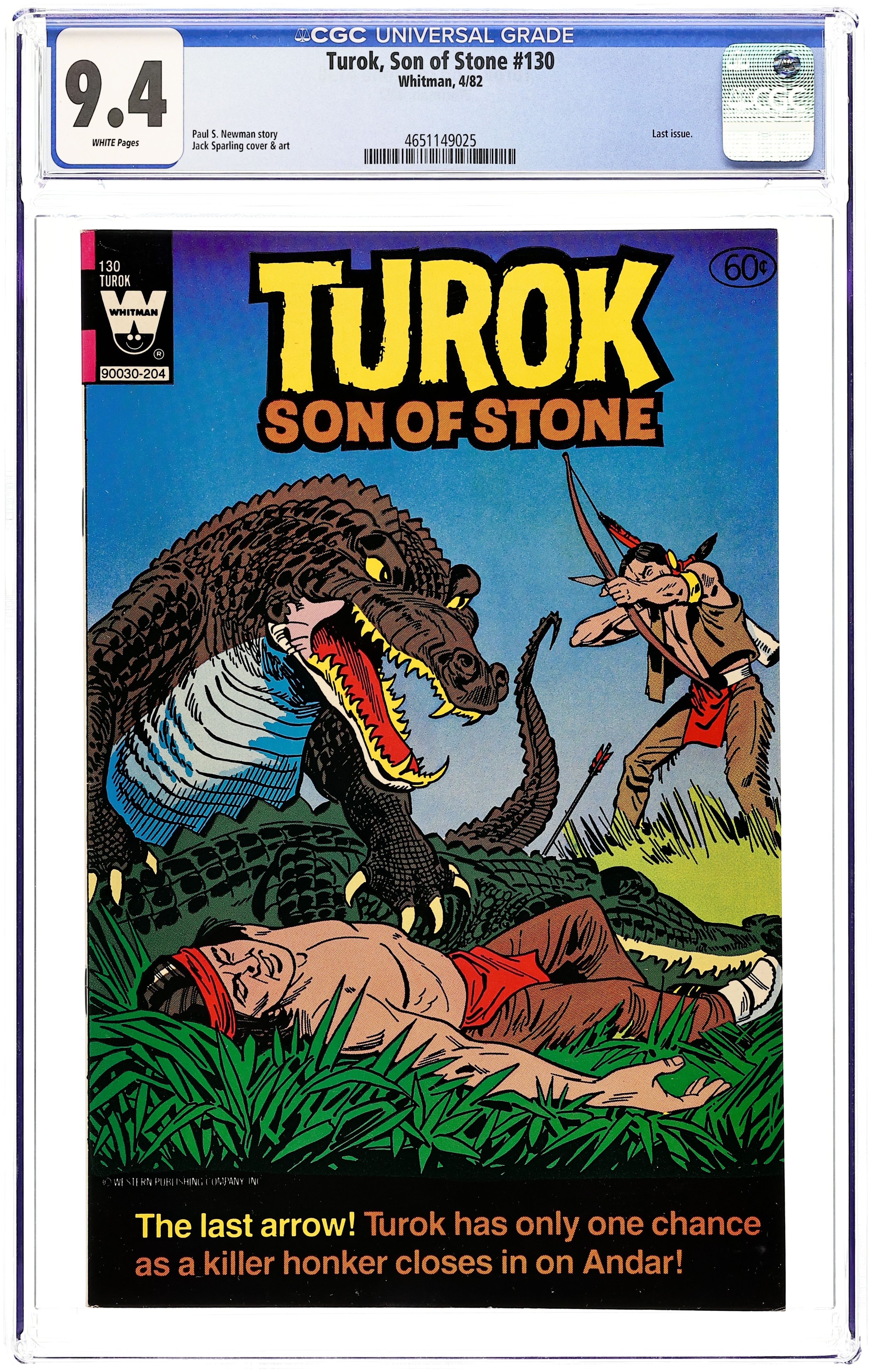 Whitman edition (no Gold Key edition was produced). Cover by Frank Bolle. Written by Paul S. Newman and unknown. Art by Jack Sparling, Giovanni Ticci and Alberto Giolitti. The last arrow! Turok has only one chance as a killer honker closes in on Andar! Turok and Andar star in "4 Arrows to Death" and "The Story Teller" by Paul S. Newman and Jack Sparling. Plus: Turok tries to rescue a kidnapped Andar in "The River Raiders," with art by Giovanni Ticci and Alberto Giolitti, reprinted from Turok Son of Stone (1956 Dell/Gold Key) #41. 36 pages, full color. Cover price $0.60.