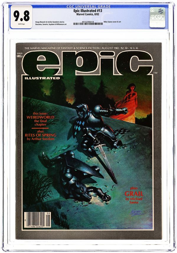 Epic Illustrated was touted as a new experience in adult fantasy and science fiction adventure. Published by Marvel Comics, this magazine was aimed at a more mature audience. Issue #13 includes: Weirdworld: Conjurations of Crystal by Doug Moench, John Buscema, Marie Severin, and Steve Oliff, In the Heart of the City by Margaret Gallagher and James Romberger, Rites of Spring by Arthur Suydam, Abraxas and the Earthman: Last Supper by Rick Veitch, Topaz by Carl Potts, Survival by Pepe Moreno, and Grail by Archie Goodwin and Mike Saenz. Also includes Bladerunner article by Archie Goodwin (with art by Al Williamson and Carlos Garzon). August 1982. Cover price $2.50.