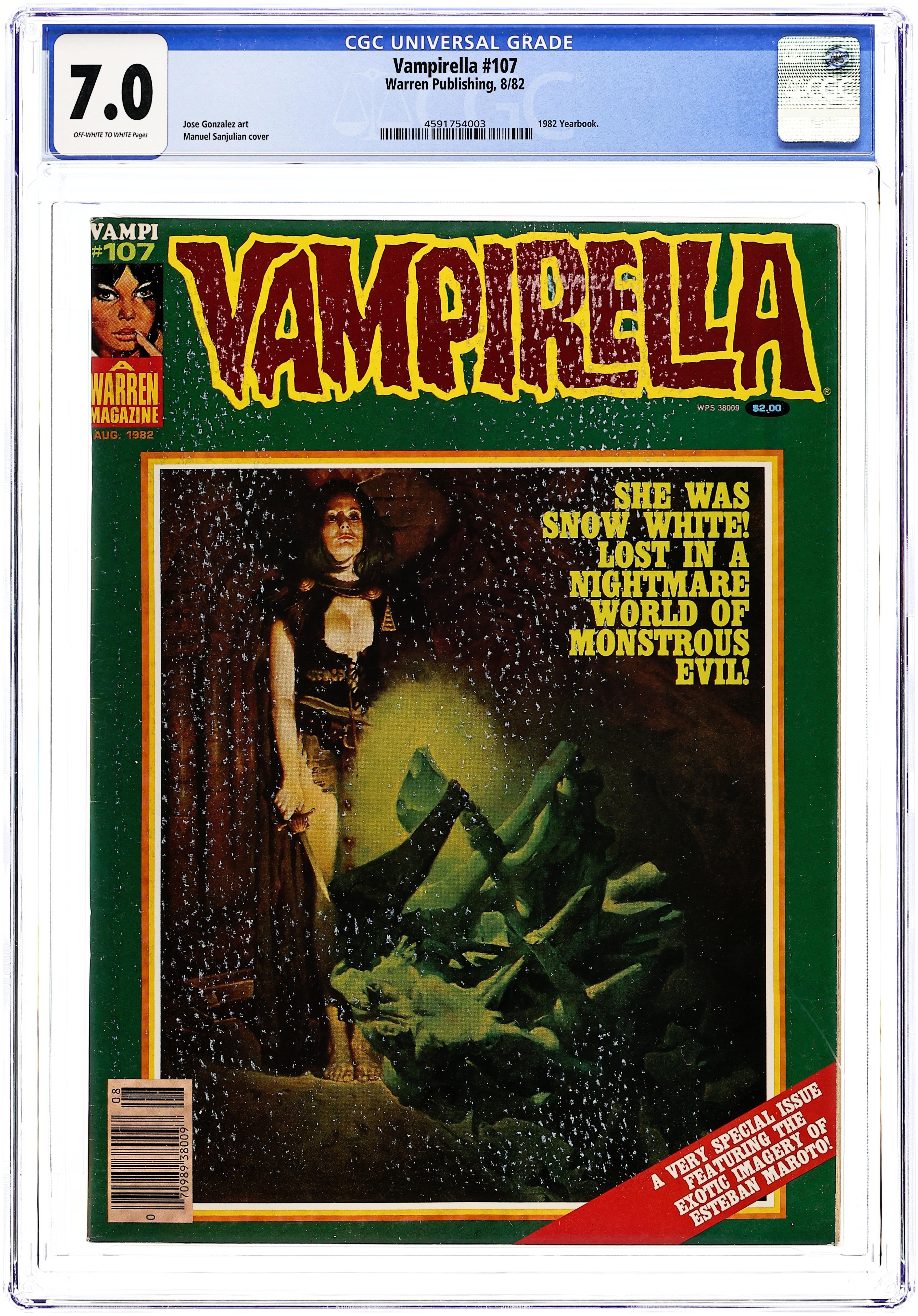 This issue reprints five stories, each of which has art by Esteban Maroto: "Vampirella: The Blood Red Queen of Hearts"; "Moonspawn"; "Black and White Vacuum Blues"; "Dracula: The Circus of King Carnival"; and "Look what they've Done." Written by Bill DuBay, Doug Moench, Gerry Boudreau, and Esteban Maroto. Cover art by Sanjulian. Cover price $2.00.