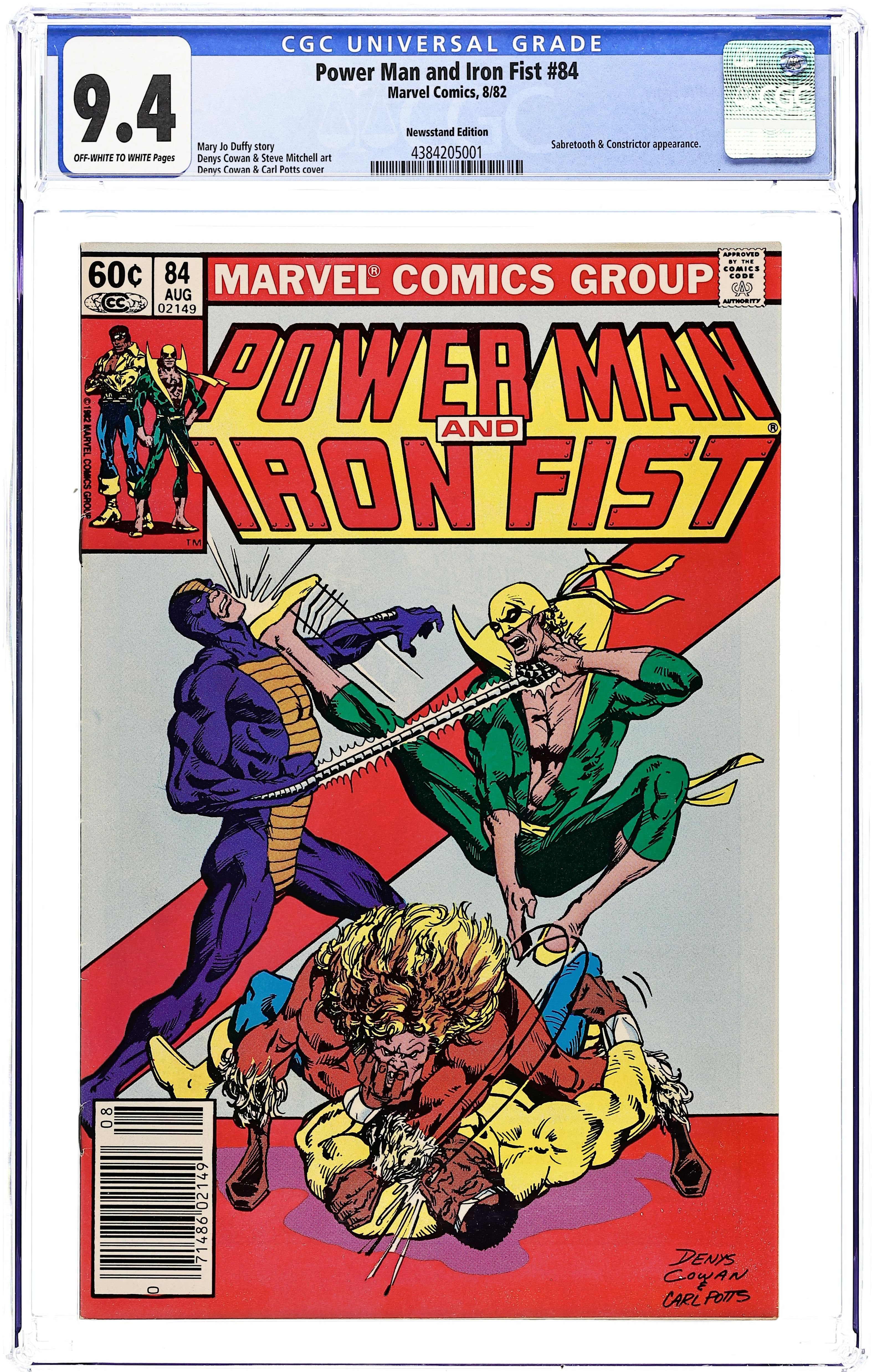 Newsstand Edition. 4th appearance of Sabretooth. "Revenge!" Daughters of the Dragon cameo. Story by Mary Jo Duffy. Art by Denys Cowan and Steve Mitchell. At last the identity of Slasher (a serial killer from Power Man and Iron Fist #78) is revealed. Power Man and Iron Fist are in the fight of their lives against the life-crushing coils of the Constrictor and Sabretooth, one of the deadliest men alive. Cover price $0.60.