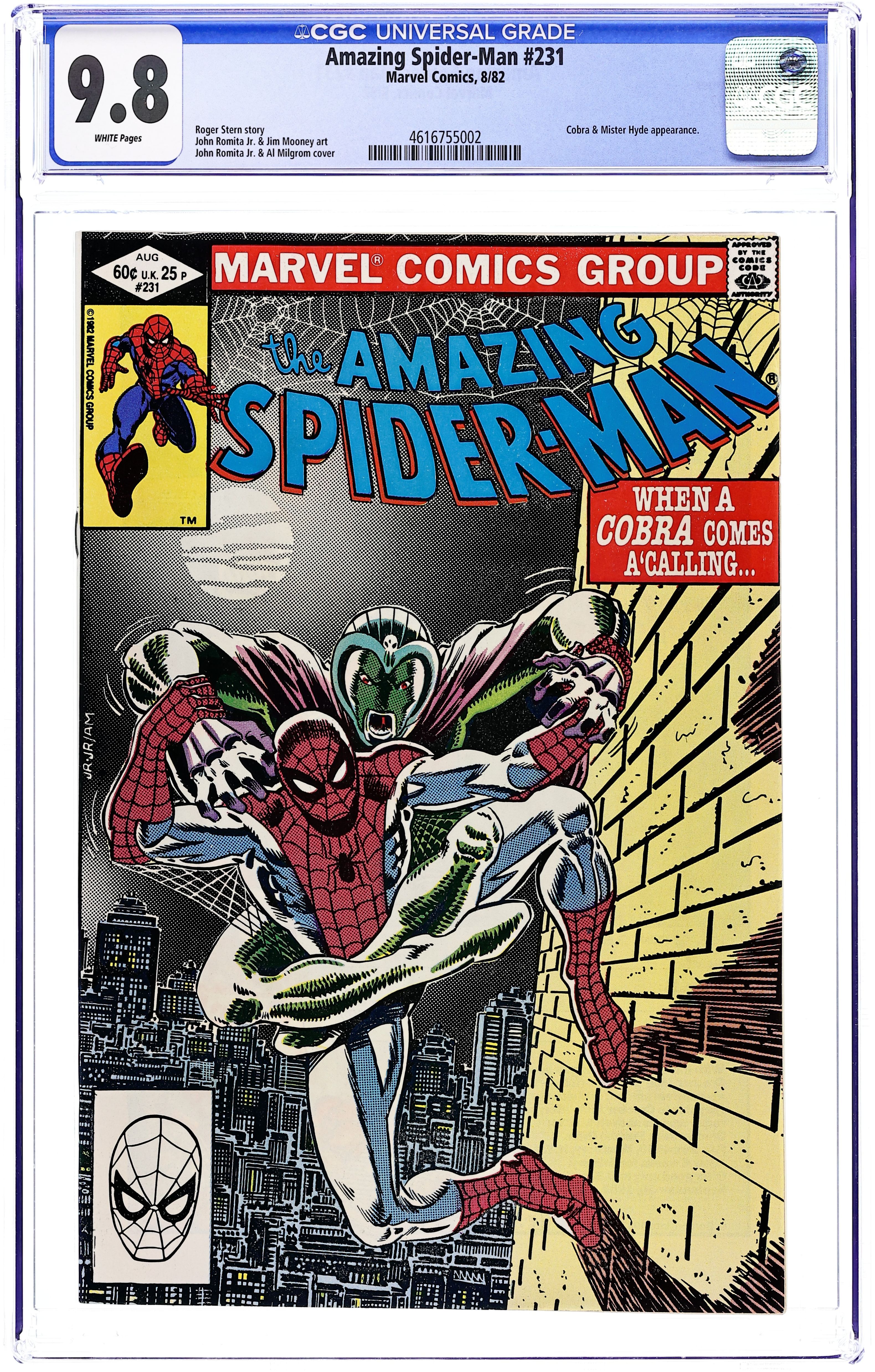 Direct Edition. Caught in the Act..." Part 1 of 2. Script by Roger Stern. Art by John Romita Jr. (breakdowns) and Jim Mooney (finishes). Cover by John Romita Jr. and Al Milgrom. All roads lead to Maxie's Bar for a pow-wow with the notorious underworld informant Nose Norton! Four people wanting to shake down the Nose gather outside this shady west side dive: Ned Leeds, Marla Madison, Spider-Man, and the Cobra! And as expected a major fracas breaks out! But Spidey isn't overly concerned because he's beaten the Cobra before (and most recently in Spectacular Spider-Man 46). However unbeknownst to the amazing one, someone else is also on the way to Maxie's Bar! Someone the web-slinger has never met. Unfortunately, it's not Doctor Jekyll...its Mister Hyde! Wow! Things are about to get real next issue! Appearances by J. Jonah Jameson and Betty Brant Leeds. Cameo by Mister Hyde. Flashback cameo by Captain America. (Notes: This story was reprinted in Spider-Man Magazine 4.) 36 pgs. Cover price $0.60.