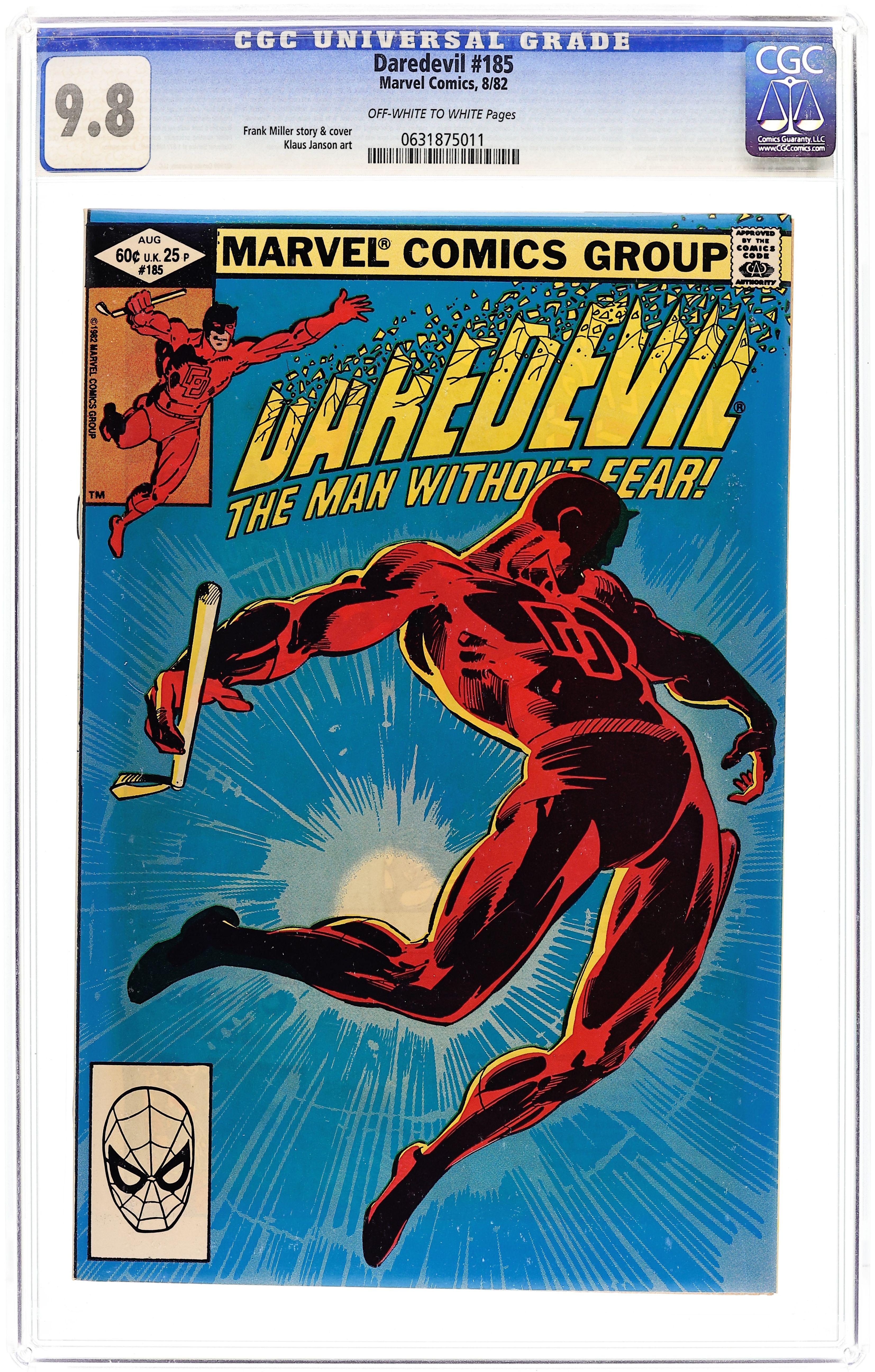 Cover pencils by Frank Miller, inks by Klaus Janson. Guts, script by Frank Miller, pencils by Frank Miller (layouts/breakdowns) and Klaus Janson (finished art), inks by Klaus Janson; Foggy begins to investigate why Heather's company is making bombs and this causes him to run up against both Eric Slaughter and the Kingpin; No problem for "Guts" Nelson and his partner Turk; DD is caught in an explosion that messes up his radar sense; story is narrated by Foggy Nelson. This issue marks Frank Miller doing rough breakdowns with Klaus Janson doing the major penciling work. Letter to the editor from comics editor Diana Schutz. 36 pgs. Cover price $0.60. Cover price $0.60.