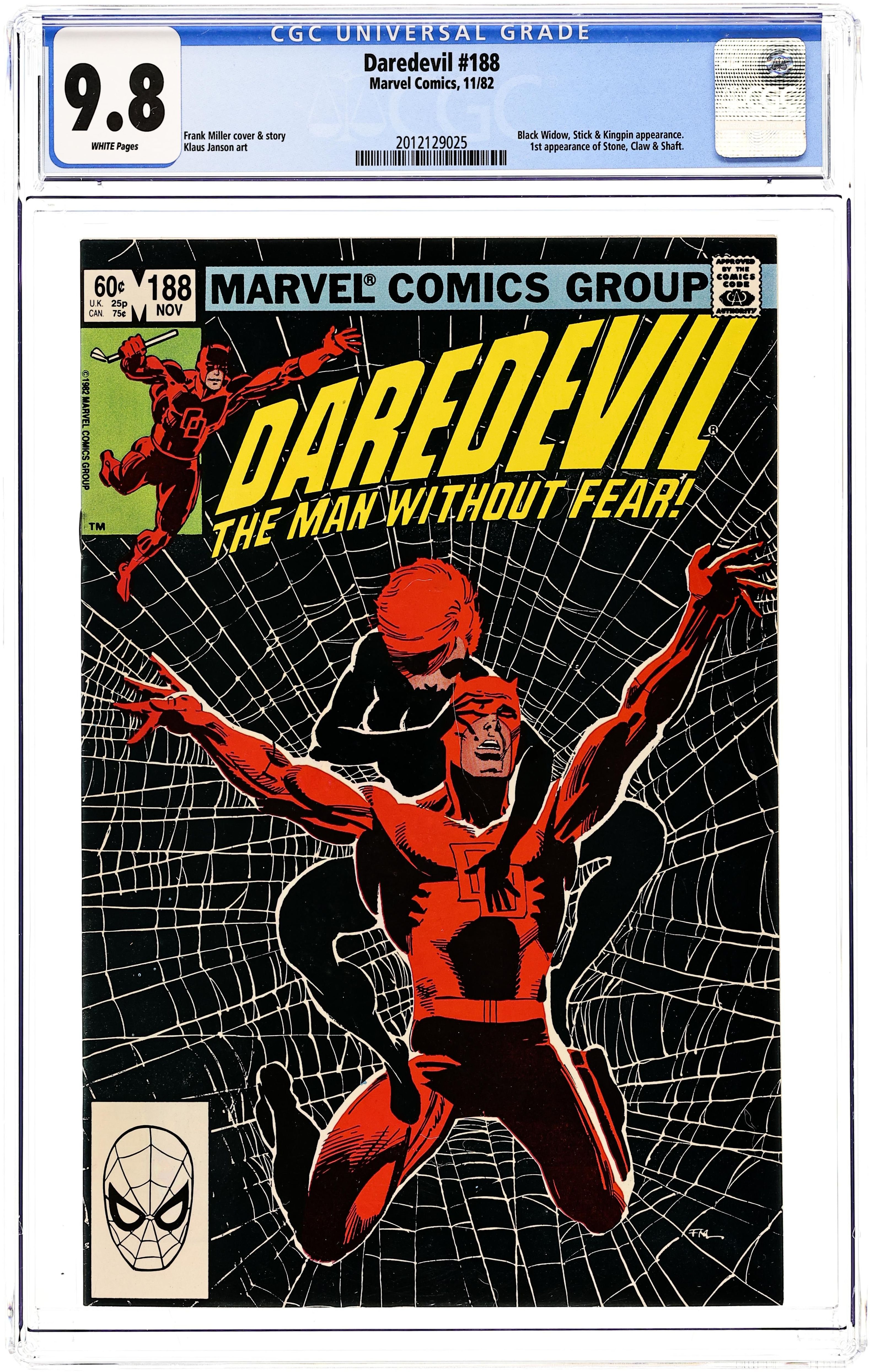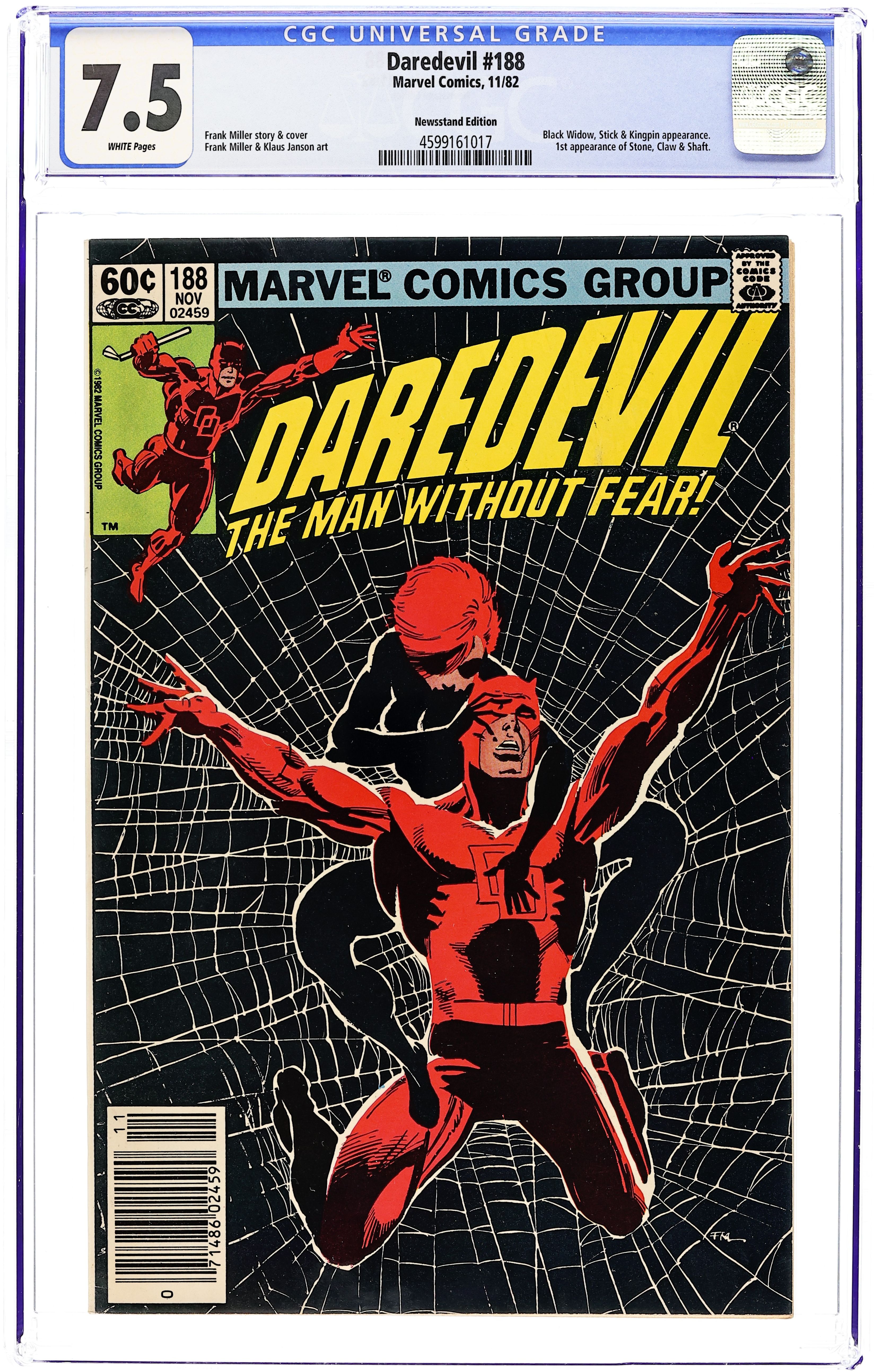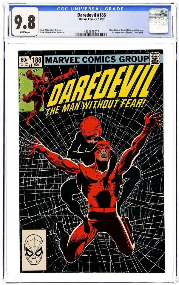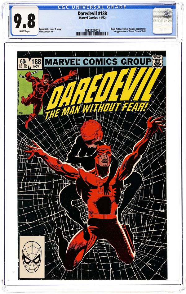 Newsstand Edition. Cover art by Frank Miller. The Widow's Bite, script by Frank Miller, pencils by Frank Miller (layouts) and Klaus Janson (finished art), inks by Klaus Janson; The Widow is dying of poison she got in a fight with the Hand and is desperately trying to find Daredevil to help; Matt is recovering his hyper senses in an isolation chamber under the watchful eye of Stick and his ninja. Frank Miller's splash page for this issue demonstrating the difference between Frank Miller's rough breakdown sketch and Klaus Janson's pencilled art; Replaces letters page. 36 pgs. Cover price $0.60. Cover price $0.60.