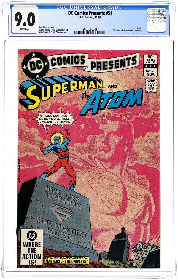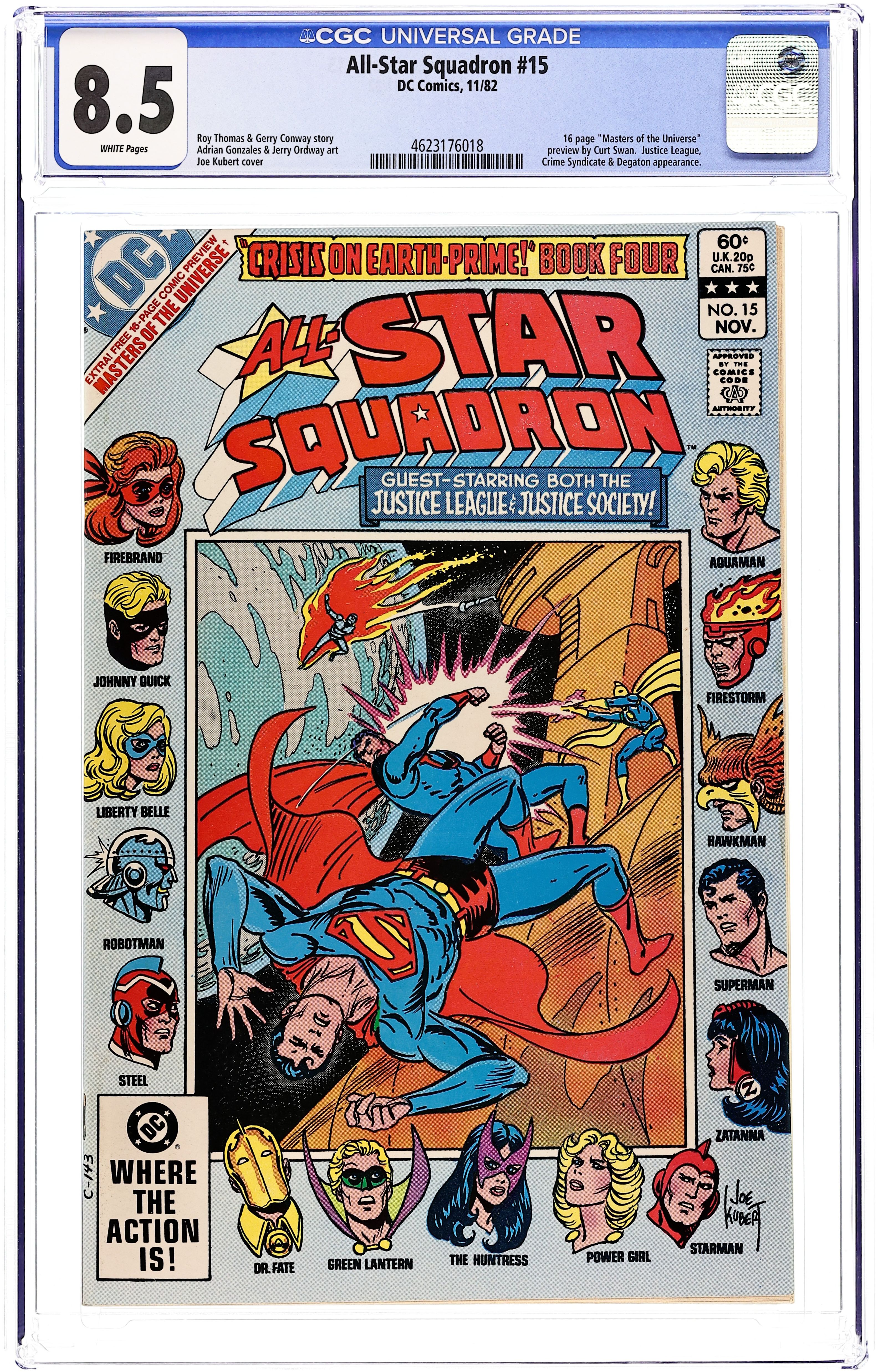 Ends Dec 8 7:10 PM CST Bid History 4 bids Current Bid $12 Your Secret Max Bid If you'd like to bid, please log in or register. Cover art by Joe Kubert. Master of Worlds and Time!, script by Roy Thomas and Gerry Conway (plot consultant), pencils by Adrian Gonzales (breakdowns) and Jerry Ordway (finished art), inks by Jerry Ordway; As the JLA/JSA/All-Star Squadron teams defeat the Crime Syndicate on both Earth-Prime in 1962, and Earth-2 in 1942, thereby preventing the stolen nuclear missiles from going off on both worlds, Per Degaton still as one more trick up his sleeve: Use the last hidden stolen nuclear missile and detonate it in 1942, thereby forcing Earth-2's leaders to surrender to him. Fate Is the Killer, script by Paul Kupperberg, pencils by Ross Andru (faux cover), Curt Swan (interior breakdowns), and Dave Hunt (interior finished art), inks by Dave Hunt; Masters of the Universe preview insert. 52 pgs. $0.60. Cover price $0.60.