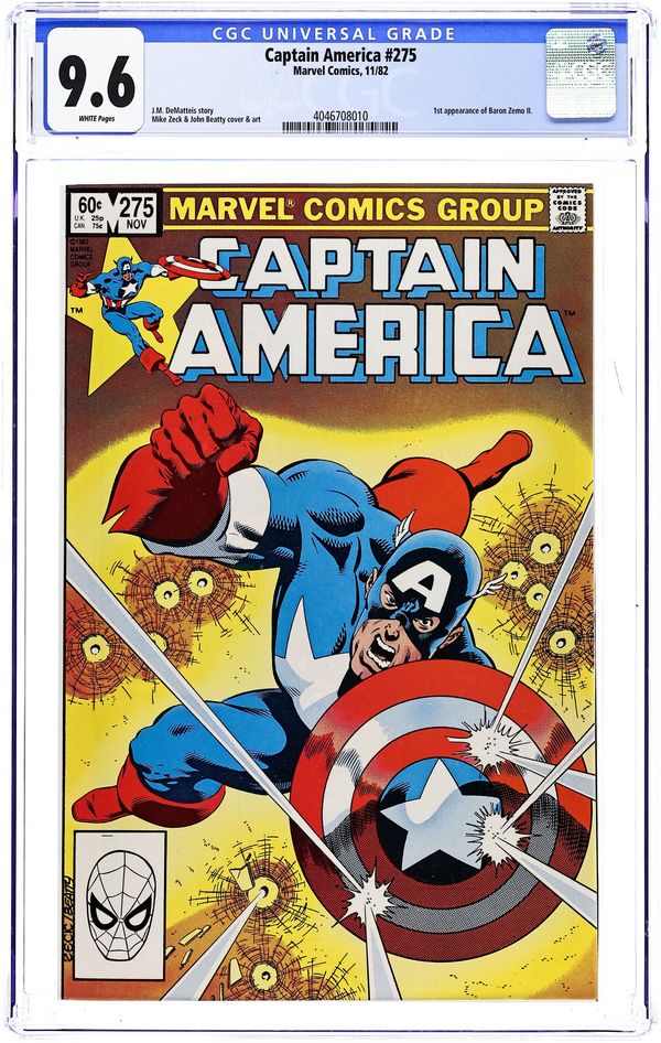 Direct Edition. First (cameo) appearance of Helmut Zemo as Baron Zemo II in "Yesterday's Shadows!" Script by J.M. DeMatteis. Pencils by Mike Zeck. Inks by John Beatty, Joe Rubinstein (uncredited), and Brett Breeding (uncredited). Cover by Mike Zeck and John Beatty. At the request of Bernie Rosenthal, Steve Rogers attends an anti-nazi rally in Long Island. The demonstration proceeds peacefully until a pro-nazi group shows up. Once violence erupts, the star-spangled avenger jumps into the mêlée to restore order! After everyone has calmed down, Captain America speaks to the crowd. And then and there...Bernie realizes that Cap's voice -- sounds just like Steve Rogers' voice. Meanwhile, Vermin escapes from SHIELD custody, and Sam Wilson (aka the Falcon) announces his intentions to run for Congress. Cameo appearances by Arnie Roth, Gail Runciter, Primus (in disguise), Sarah Wilson, and Peter Parker. (Notes: Helmut Zemo first appeared in Captain America 168 under the nom de guerre of the Phoenix. The DeMatteis-Zeck run on the Captain America title hits its stride with issue 275.) 36 pages. Cover price $0.60.