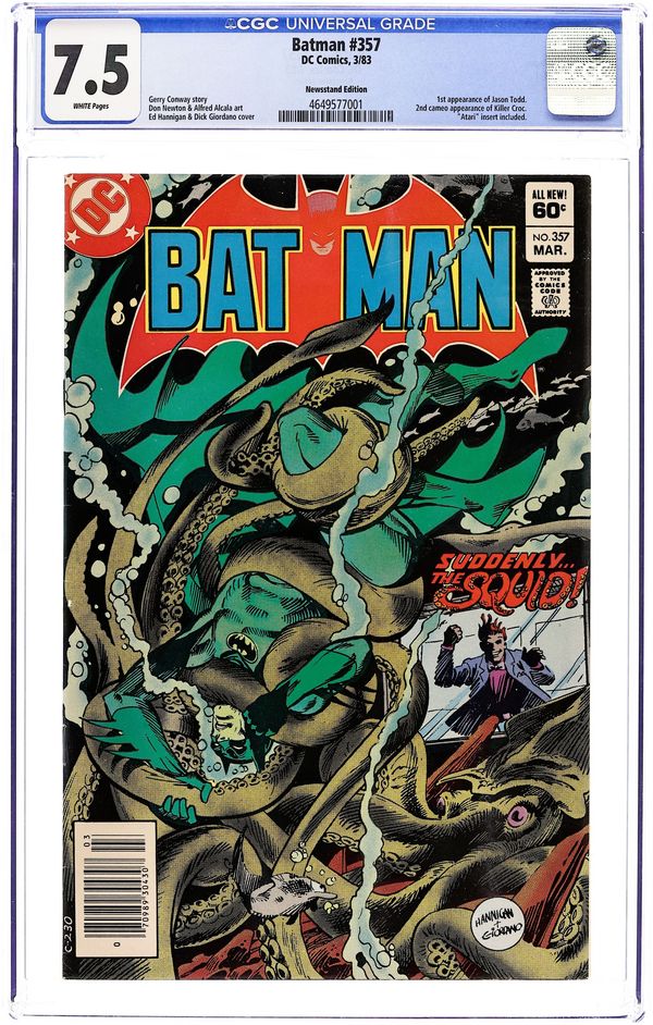 Newsstand Edition. Cover pencils by Ed Hannigan, inks by Dick Giordano. "Deathgrip," script by Gerry Conway, pencils by Don Newton, inks by Dick Giordano; Story continued from Batman #357. Batman escapes the Squids giant-squid deathtrap, but the Squid himself is assassinated by Croc. "Mob Rule! II: Heat of the Moment!", script by Joey Cavalieri, pencils by Irv Novick, inks by Ron Randall; Green Arrow finally defeats the Executrix with reflector-signal arrows and pumps her for information about Machiavelli; In the meantime, Machiavelli is huddling with the Wall Street Irregulars and convinces them that criminals can run Star Citys government better than its elected officials; Later, Machiavelli and his group crash a town meeting on the anti-strike clause, at which the villain gives a political speech and is greeted with Mac for mayor! cries. 1st appearance Jason Todd (cameo only). 36 pgs., full color. $0.60. Cover price $0.60.