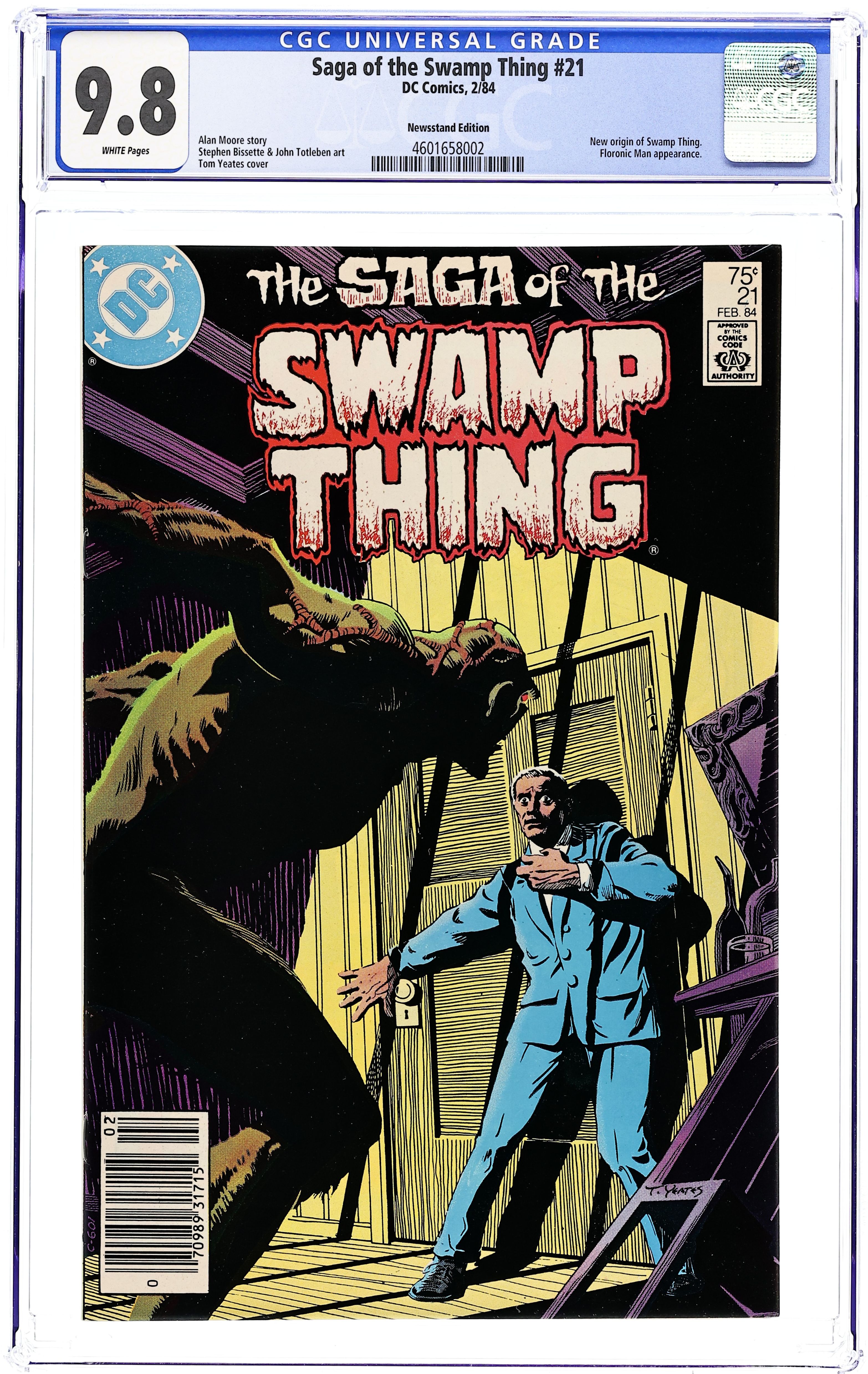 Newsstand Edition. Cover art by Tom Yeates. The Anatomy Lesson, script by Alan Moore, art by Stephen R. Bissette and John Totleben; General Sunderland hires Jason Woodrue to examine Swamp Thing and determine how Alec Holland became the monster, but Woodrue discovers that Swamp Thing only thinks that he was Alec Holland; When Sunderland fires Woodrue, the scientist allows Swamp Thing to take revenge on Sunderland for the both of them; new origin for Swamp Thing. 36 pgs., full color. $0.75. Cover price $0.75.