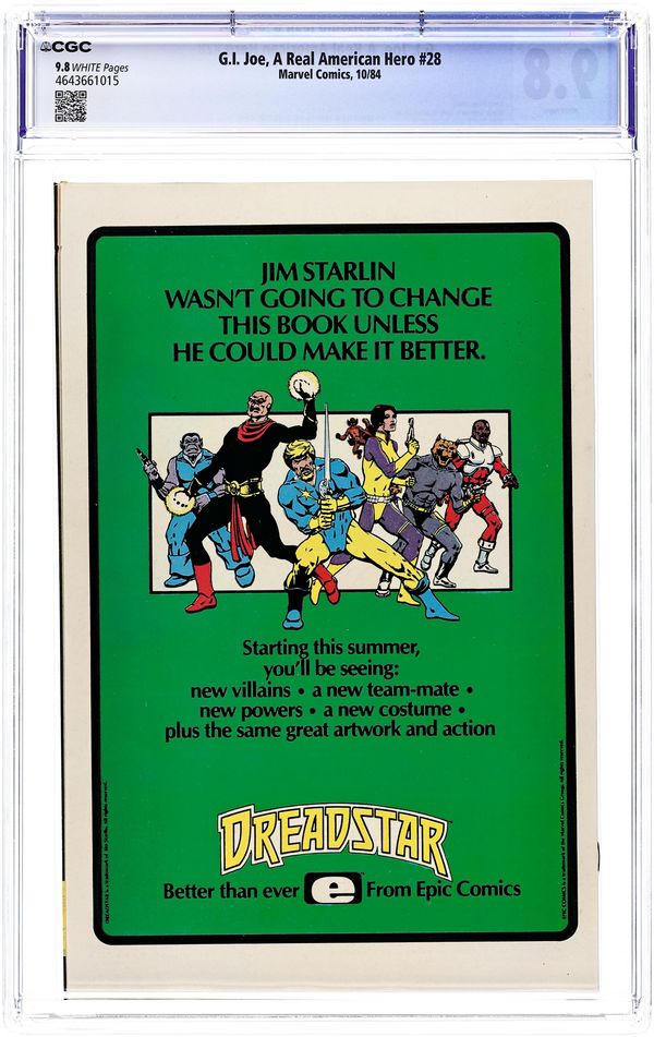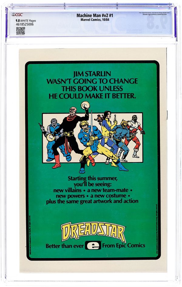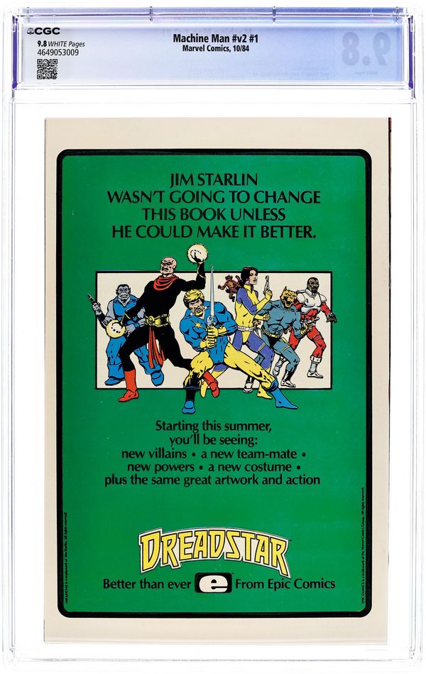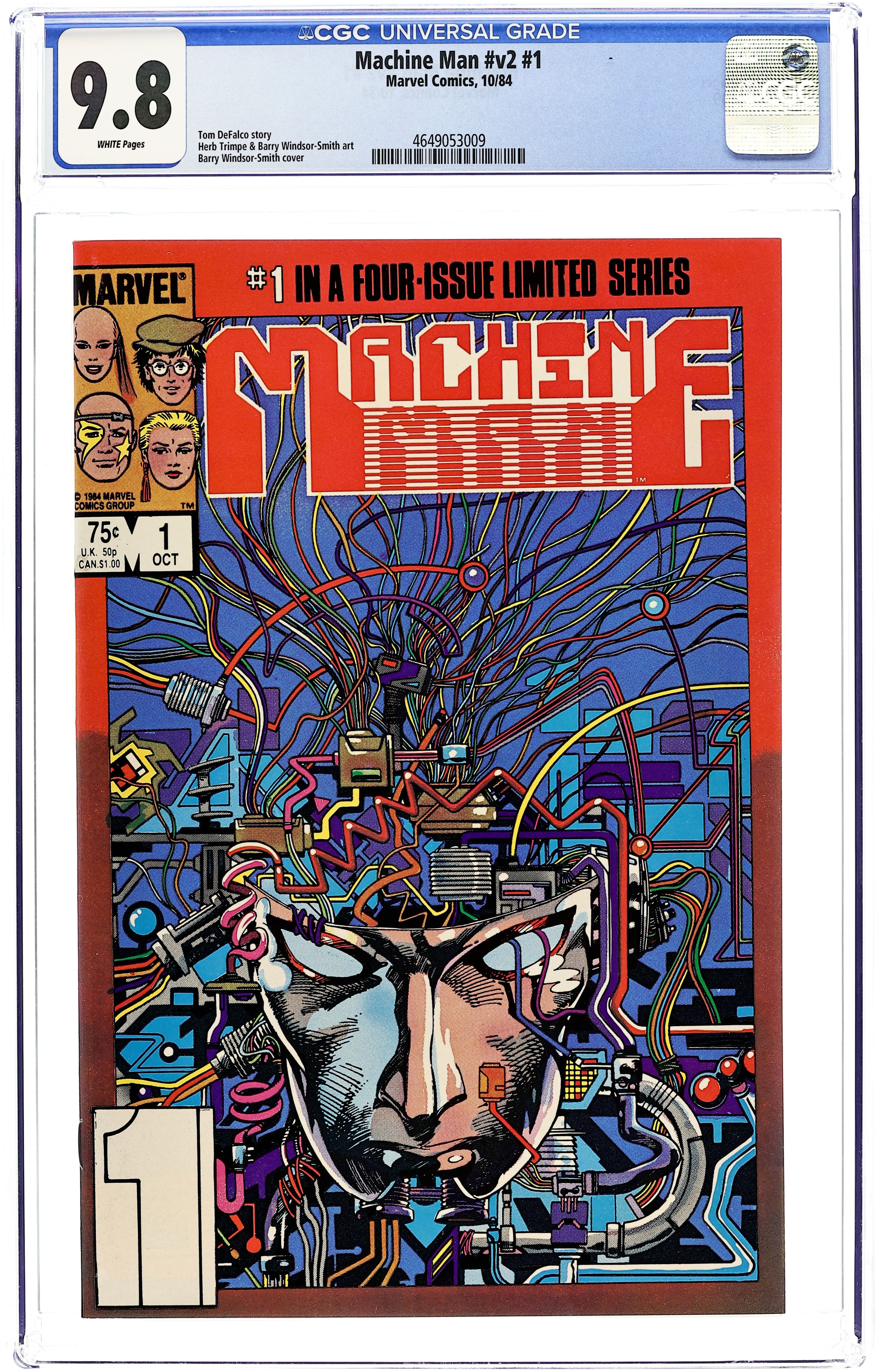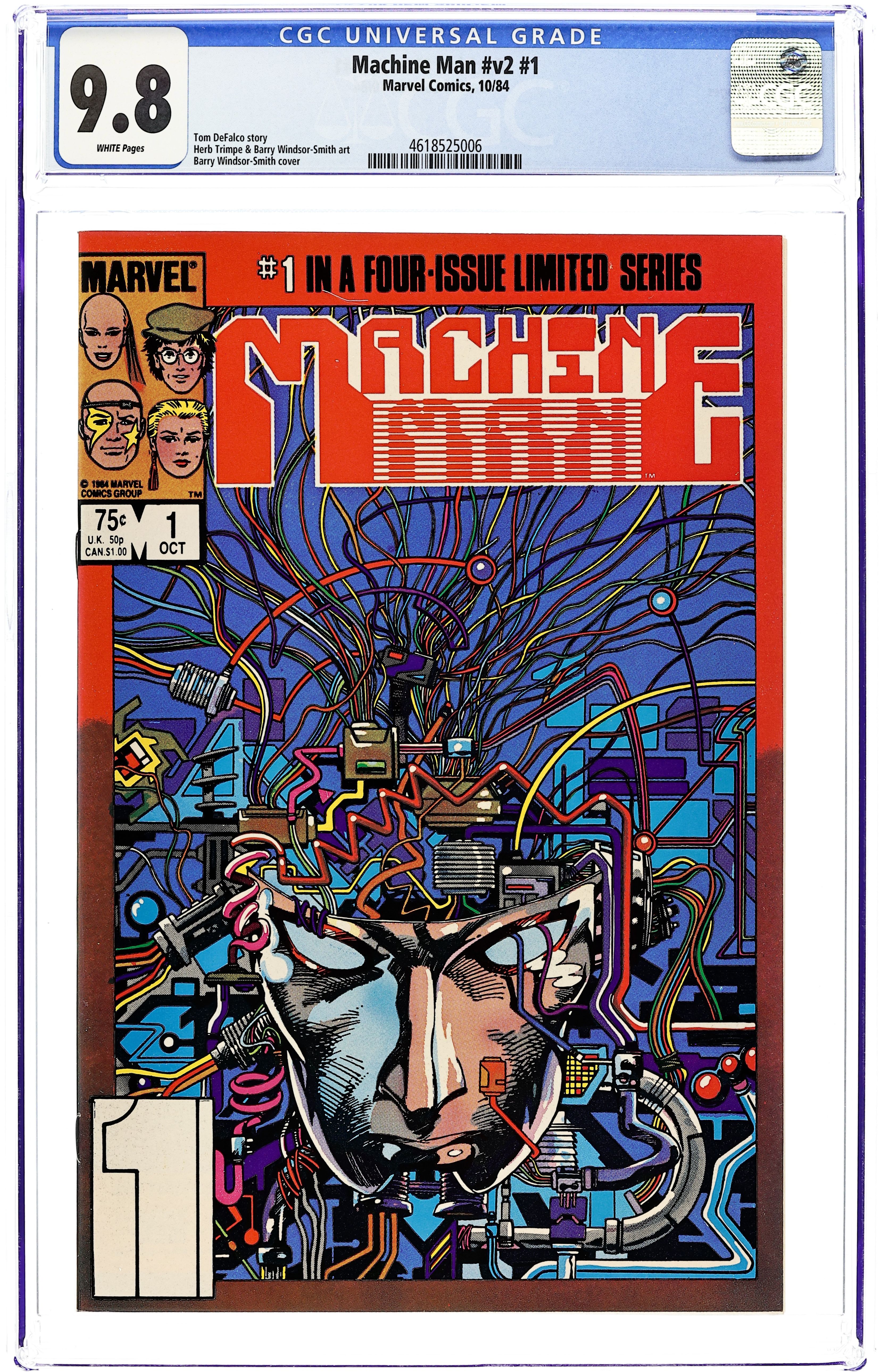Direct Edition. Script by Tom DeFalco, breakdowns by Herb Trimpe, finishes & colors by Barry Windsor-Smith. Cover by Windsor-Smith. Machine Man is found in the year 2020 by scavengers Brain, Slick, Hassle & Swift. He's promptly reassembled and finds himself in a fight for their lives in the 25-page "He Lives Again!" Cover price $0.75.