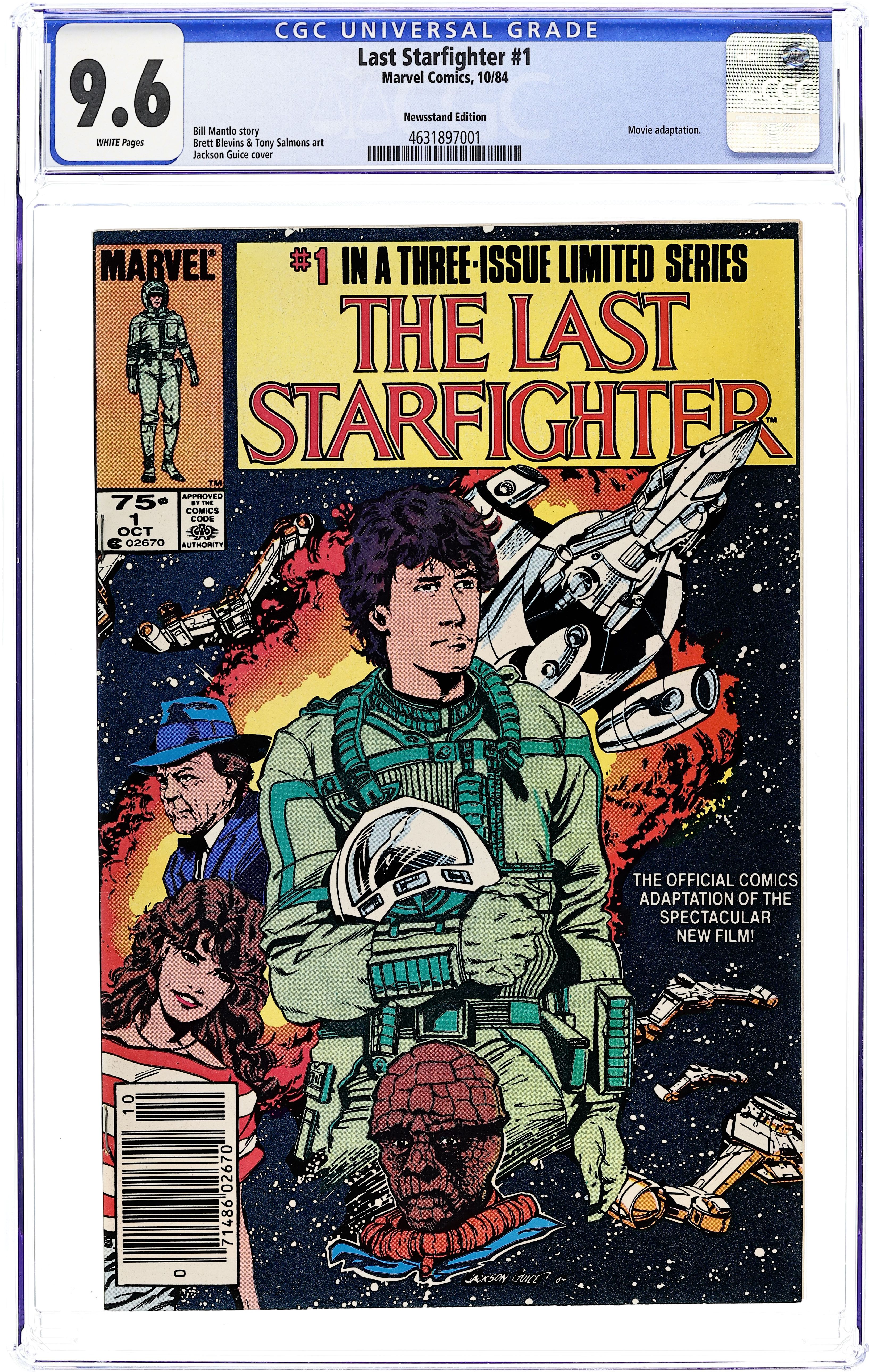 Newsstand Edition. Marvel Comics' official comic adaptation of the 1984 movie "The Last Starfighter." In this issue, Alex plays a video game and makes a record high score on it and then a man named Centauri arrives and wants to recruit him to help fight a space war in part one of this adaptation. Script by Bill Mantlo and art by Brett Blevins & Tony Salmons. Cover price $0.75.