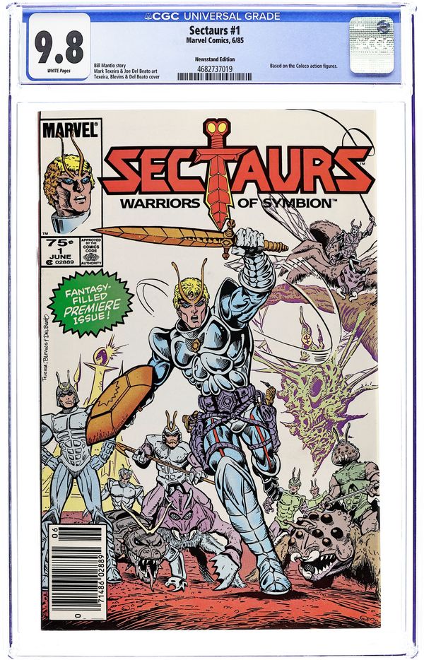 Direct Edition. Upheaval! - Written by Bill Mantlo. Art by Mark Texeira, Joe DelBeato and Art Nichols. Cover by Mark Texeira, Bret Blevins and Joe DelBeato. Fantasy-filled premiere issue! New from the House of Ideas -- Marvel goes beyond reality as we know it to bring you an entire race of super-beings: the Sectaurs! Led by Dargon, heir to the throne of the Shining Realm, the heroes of Symbion must fight to save their world from the merciless hordes of Empress Devora! Plus: 1-page "The World of Symbion" map. Printed on Mando paper. 32 pages, full color. Cover price $0.75.