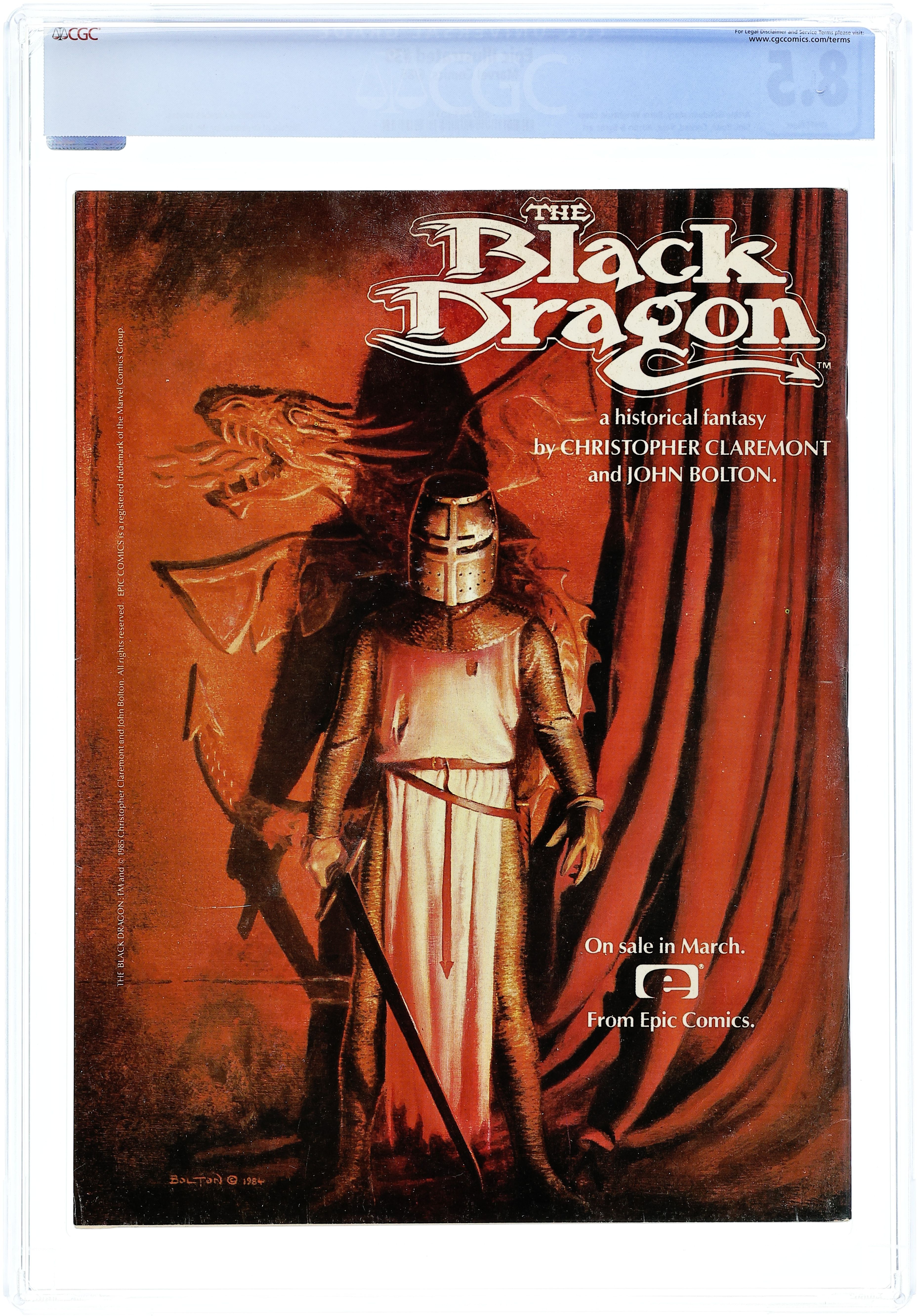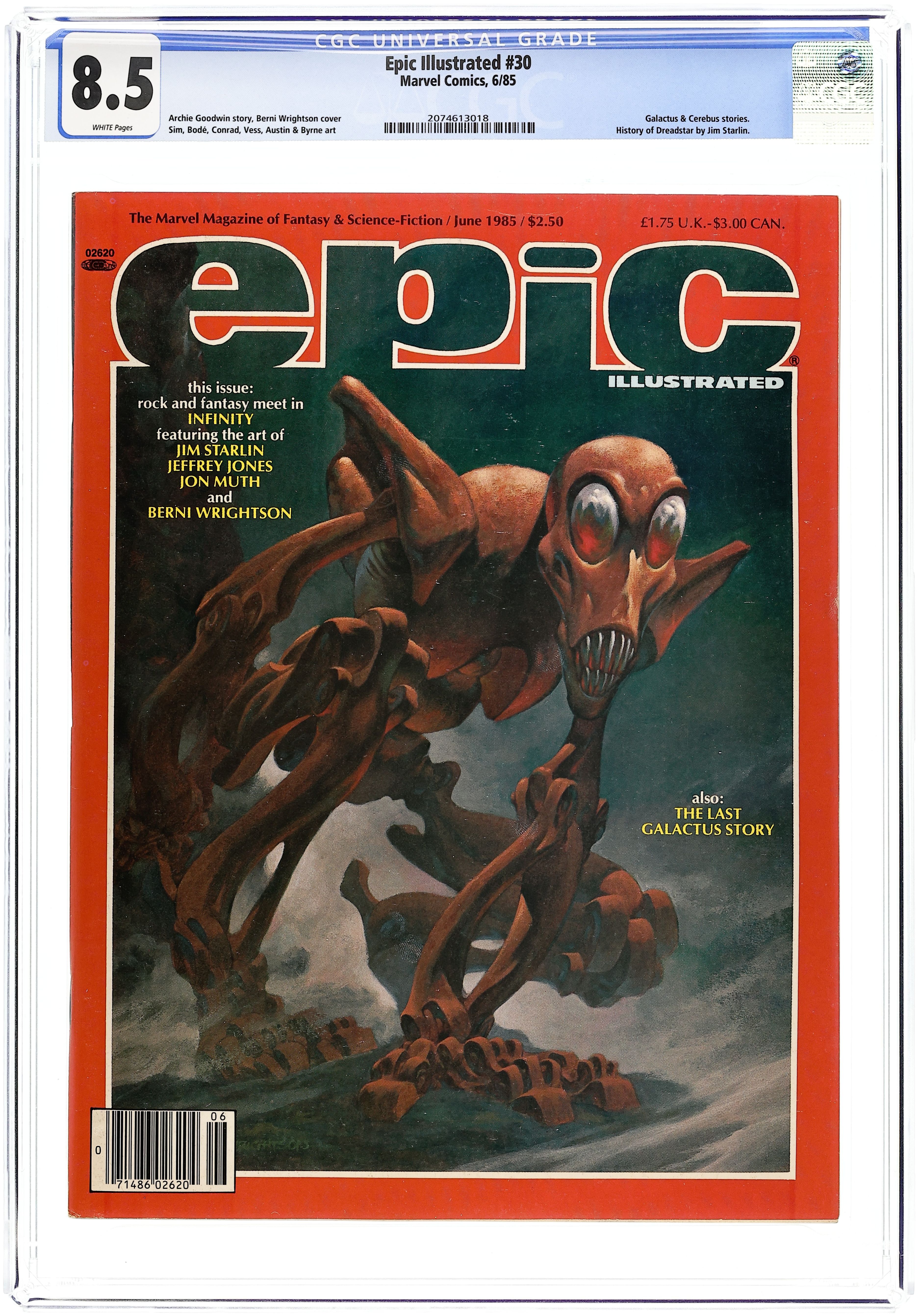 Cover art by Berni Wrightson. The End of the Earth (Chapter Five) (Table of Contents)--The Last Galactus Story, script and pencils by John Byrne, inks by Terry Austin. Selling Insurance starring Cerebus, script by Dave Sim, pencils by Dave Sim and Gerhard (backgrounds), inks by Dave Sim and Gerhard. The Girl Next Door starring Cerebus, script by Dave Sim, pencils by Dave Sim and Gerhard (backgrounds), inks by Dave Sim and Gerhard. Infinity: Where Rock and Fantasy Art Meet article, art by Glenn Pepple, Anita Barbour, Daina Graziunas, Jim Starlin, Berni Wrightson, Jeffrey Jones, Alin Wilson, Jon Jay Muth, Dan Green, and Alex Bialy. Cobalt- 60 story, script by Larry Todd, art by Mark Bode. Unicorn Autumn text story by Archie Goodwin, art by Alix Berenzy. Mediaview article by Dennis O'Neil. The Sign, script by Jo Duffy, pencils by Kent Williams. An Epic History featuring Dreadstar article by James P. Starlin. Raven Banner Marvel Graphic Novel Preview, script by Alan Zelenetz, art by Charles Vess. Journey to Outer Earth, script and art by Rick Geary. Toadswart story, script and art by Tim Conrad. The Fix, script and art by Pepe Moreno. 100 pgs. June, 1985. $2.50. Cover price $2.50.