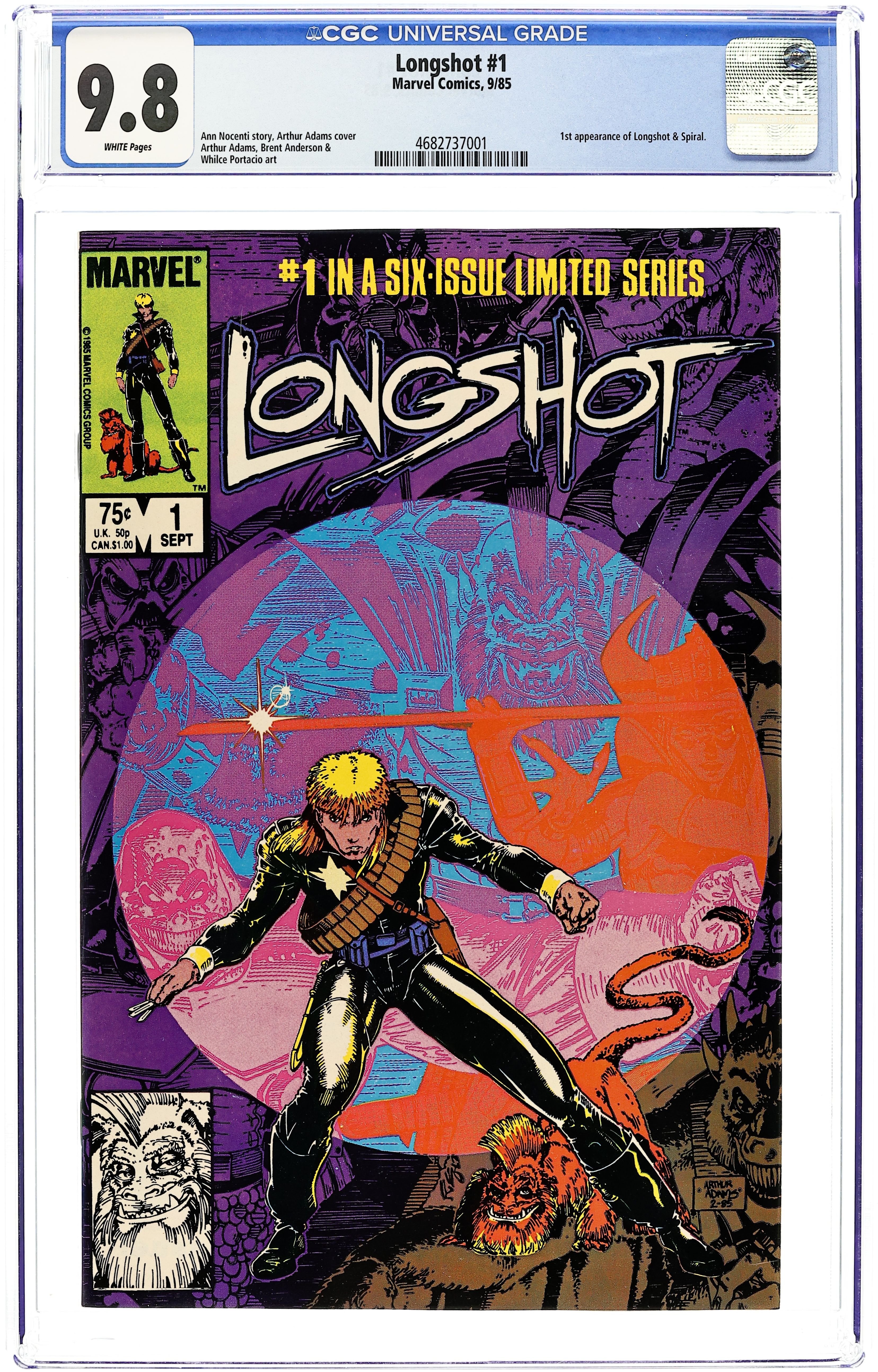Newsstand Edition. 1st Art Adams pro work. Arriving on Earth unsure of his own identity, Longshot tries to rescue a kidnapped baby in "A Man Without a Past." Script by Ann Nocenti. Pencils by Arthur Adams (his first pro work). Inks by Whilce Portacio & Anderson. Cover by Adams. 1st appearance of Longshot and Spiral. Cover price $0.75.