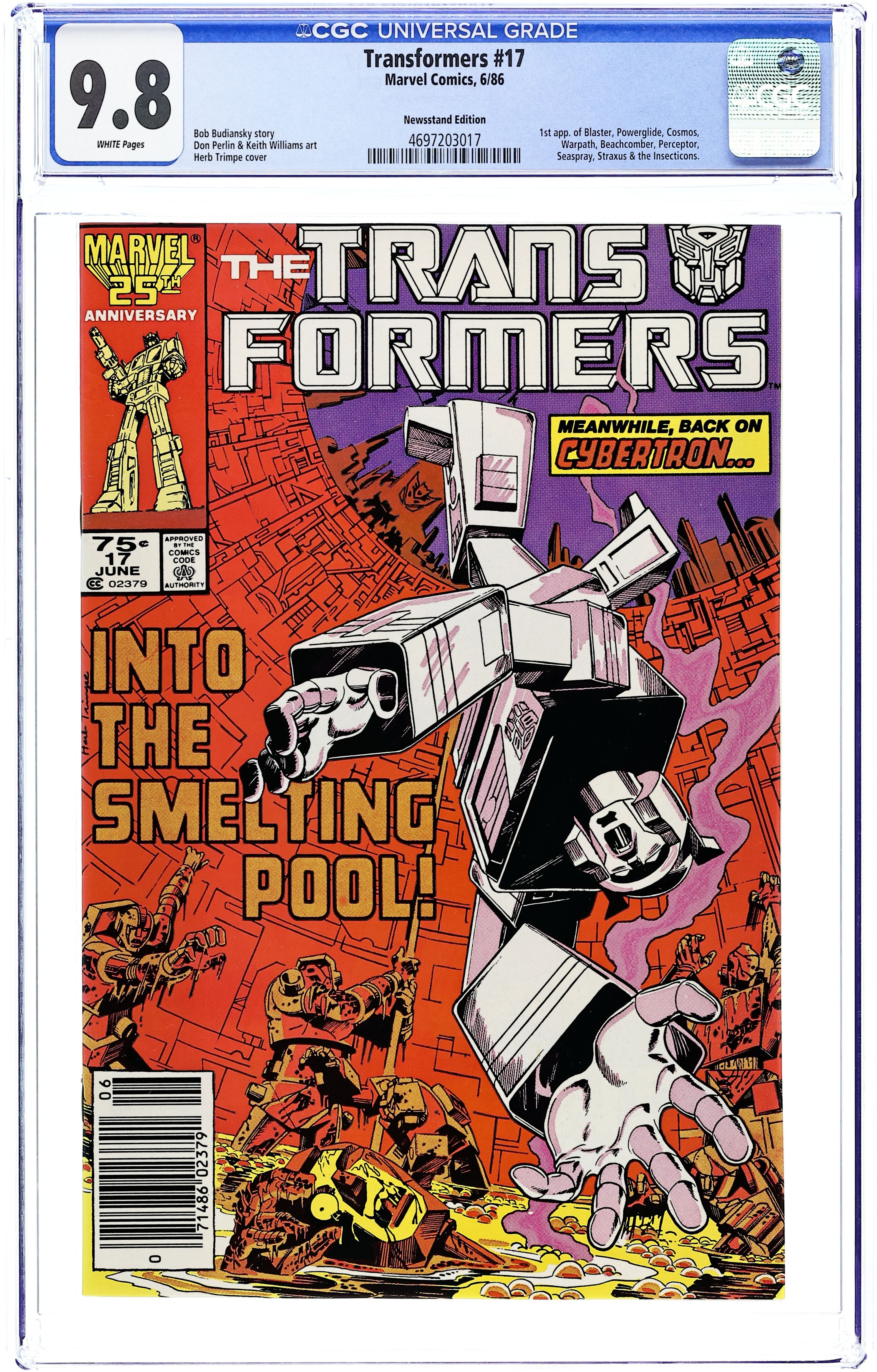 First Printing. Newsstand Edition. Back on Cybertron, the home planet of the Transformers, the war between the Decepticons and Autobots continues. Scrounge, an Autobot, discovers important and revealing news but is kidnapped before he can relay the news to his Autobot comrades. So Blaster and the other Autobots resolve to find and rescue Scrounge in "Return to Cybertron – Part 1 – The Smelting Pool." Script by Bob Budiansky and art by Don Perlin & Keith Williams. Cover by Herb Trimpe. Cover price $0.75.