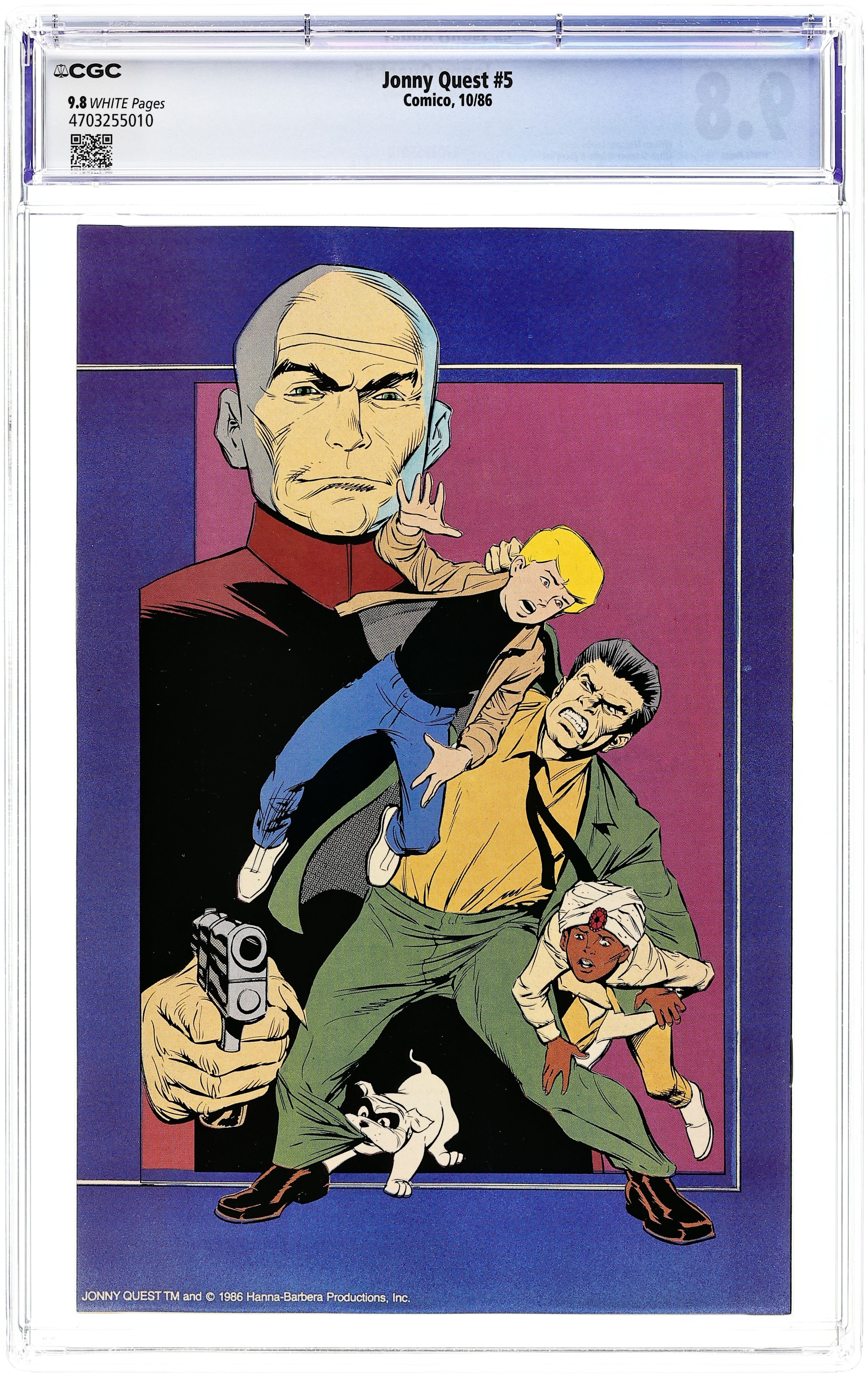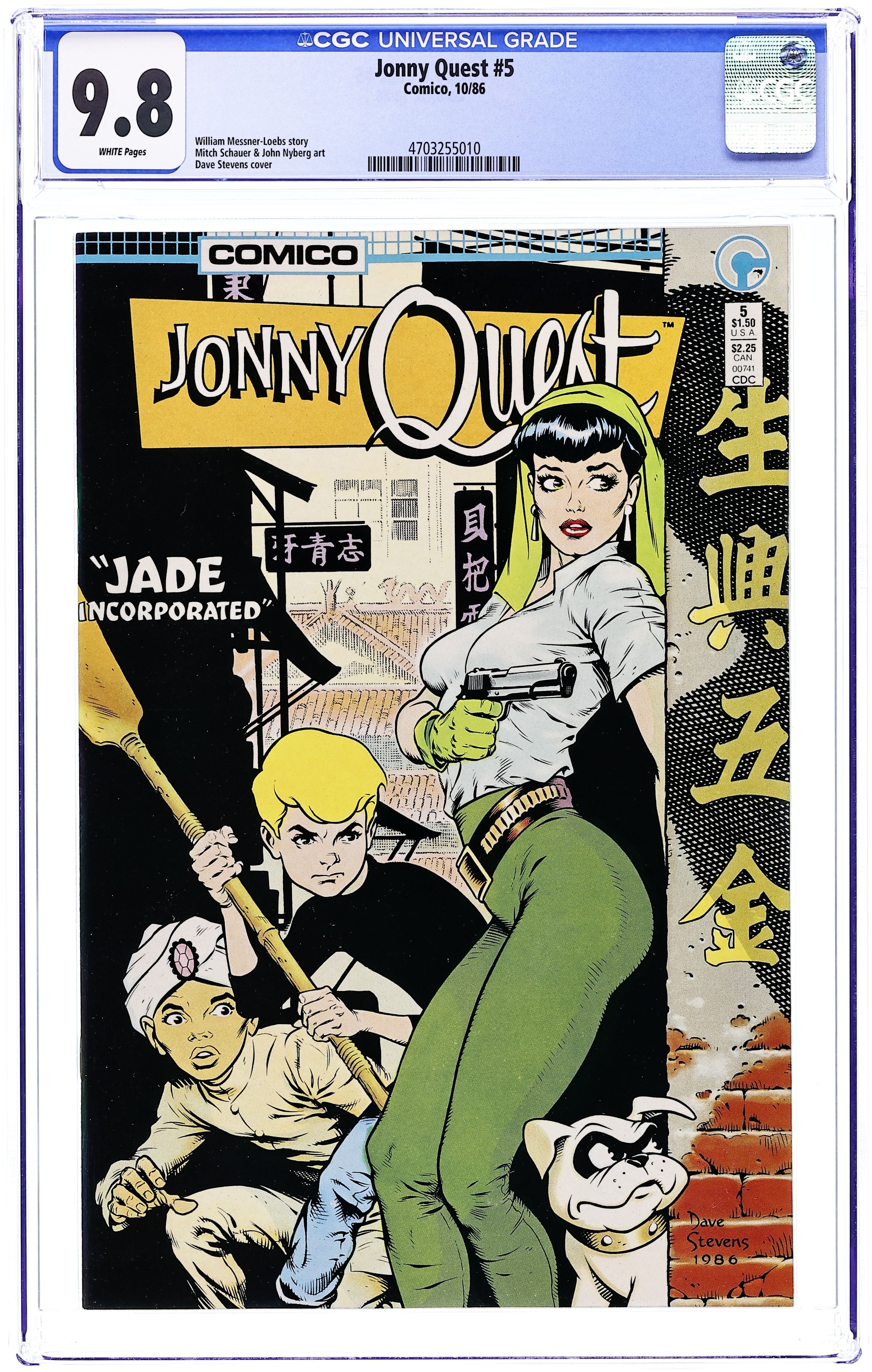Jezebel Jade wants Race's help. But since he's not available, Jonny and Hadji come to her aid in "Jade Incorporated." Script by William Messner-Loebs and art by Mitch Schauer and John Nyberg. Issue also has Jonny Quest pinups inside and on back cover. Front cover is by Dave Stevens. Cover price $1.50.
