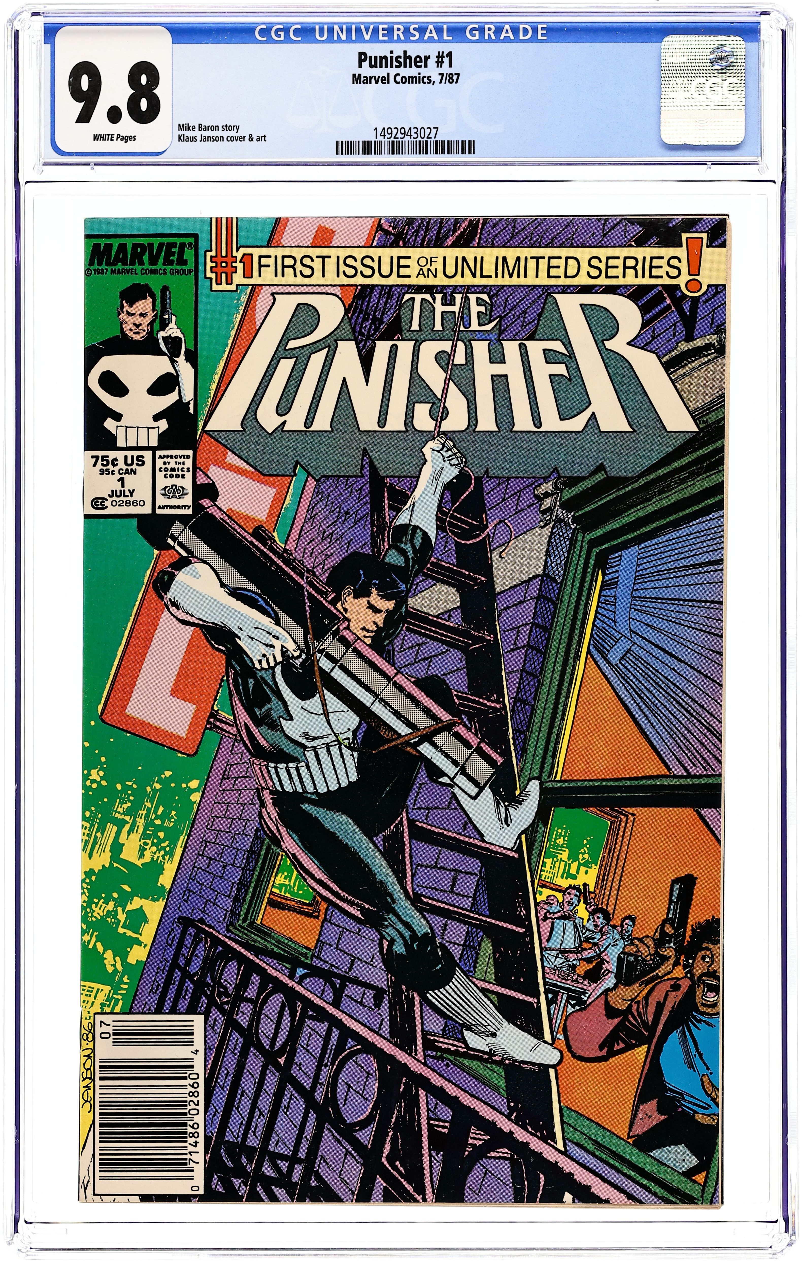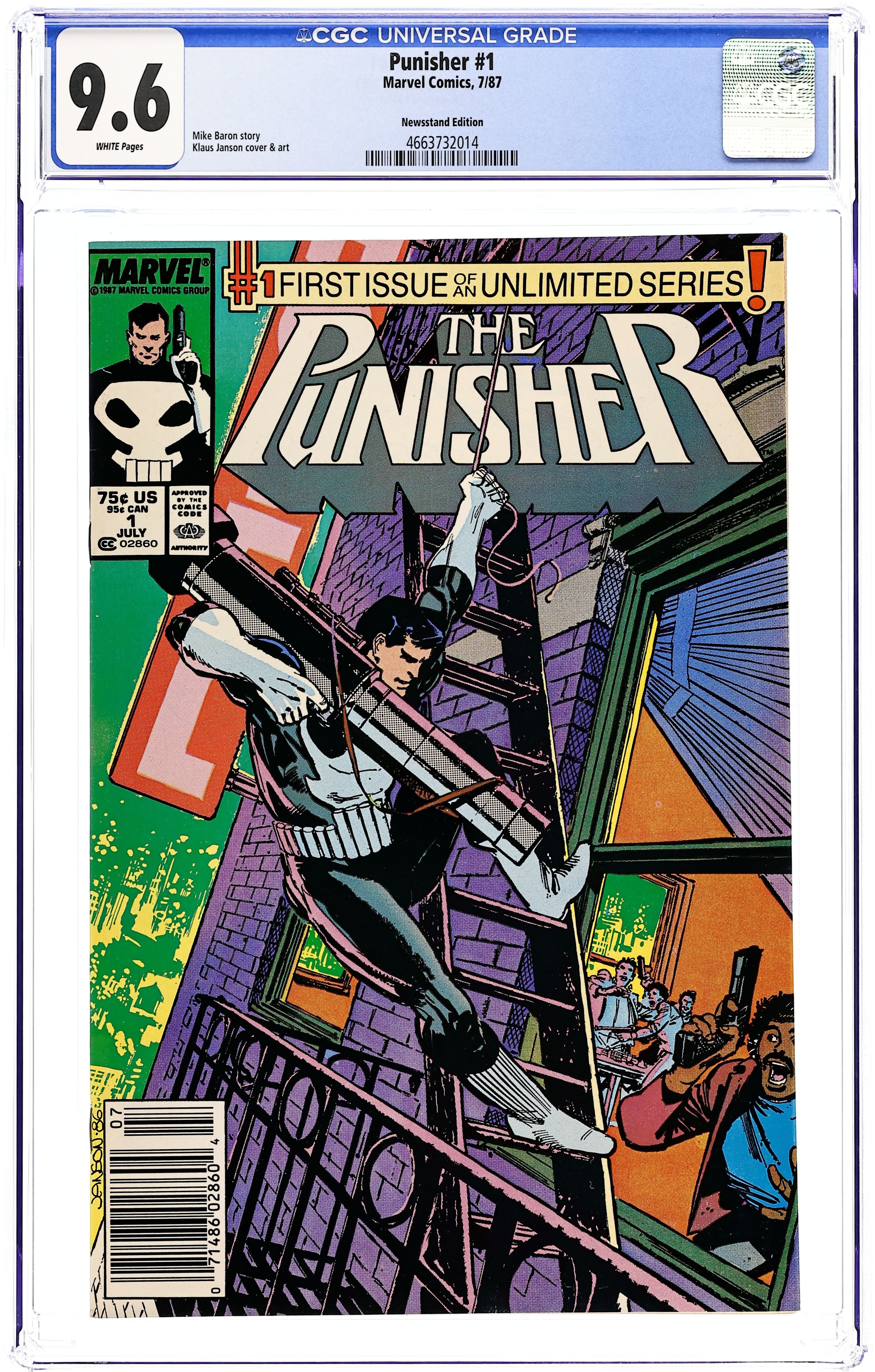 Newsstand Edition. Story by Mike Baron. Art by Klaus Janson. Vietnam vet Frank Castle's wife and children were caught in the crossfire of warring crime families. Now, he's back and they're all going to pay. All of them. Those that visit harm on others will come to know him as the Punisher. Frank starts up his first ongoing series with guns blazing. His first target, a drug dealer who thinks he's above the law. Well, he's not above Punishment. Cover price $0.75.