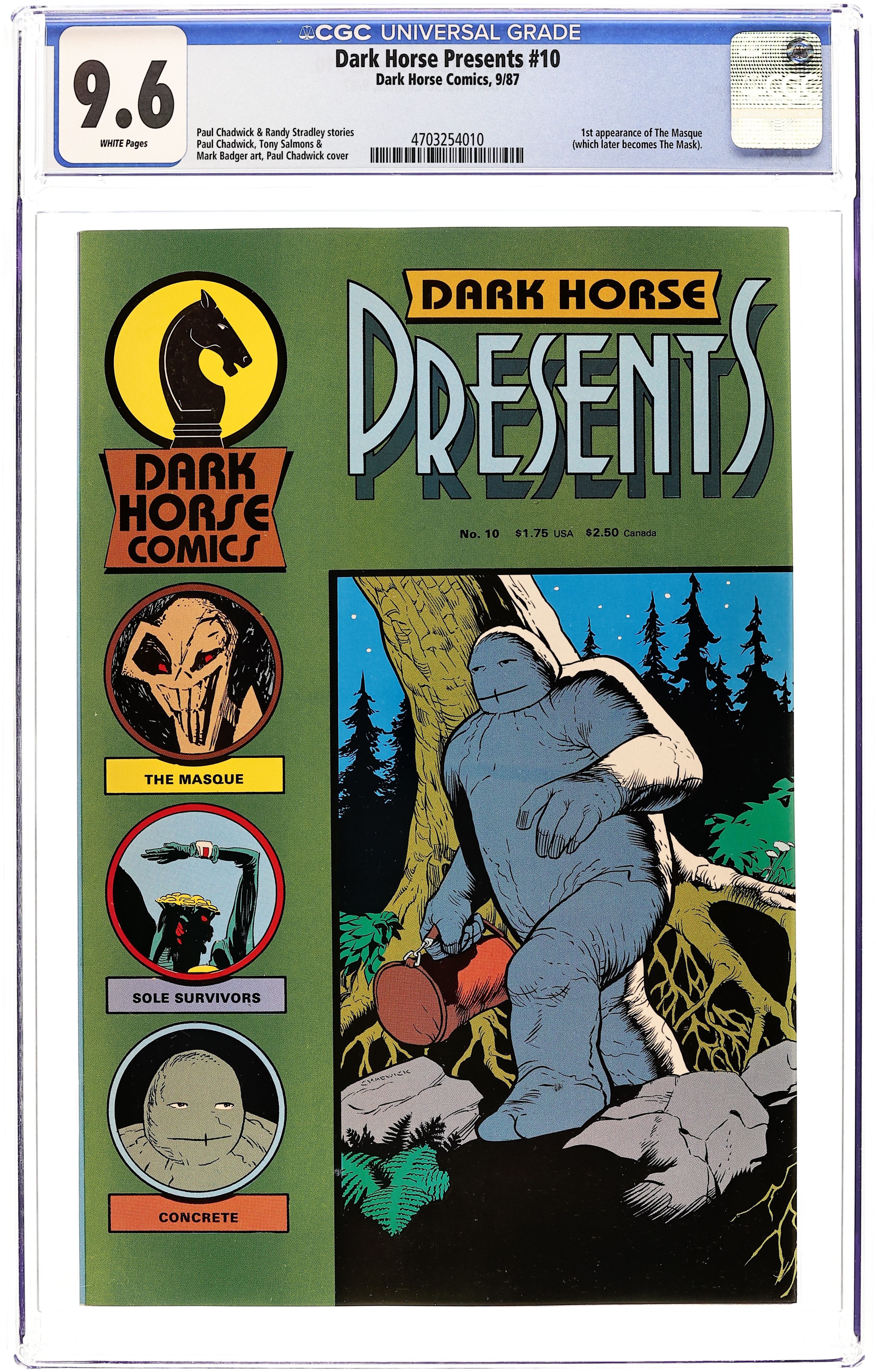 An anthology of original stories. Cover by Paul Chadwick. Straight in the Eye, script and art by Paul Chadwick; Concrete has agreed to help a man look for his lost brother who's last location was in the woods; The man's brother (Adam) is a stuntman who often takes enough fuel to fly and sleeps under the wing of his biplane. Masque (Part 1), script and art by Mark Badger; Two men arguing in a church in Manhattan about a man named Montoya; Cut to Newark airport where a group of what are assumed F.B.I agents are trying to find Montoya, after some squabbling he is apprehended but it turns out it's the wrong man; Montoya is then spotted and is chased into a bizarre room; The Masque appears and is subsequently shot. Sole Survivors, script by Randy Stradley, art by Tony Salmons; An Alien takes cover behind a rock and is in a Mexican standoff with another lone alien. 36 pgs., B&W. $1.75. Cover price $1.75.