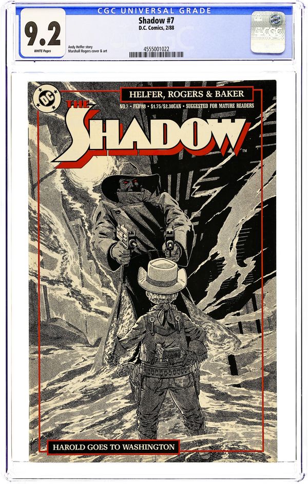 Cover by Marshall Rogers. Harold Goes to Washington, script by Andy Helfer, art by Marshall Rogers and Kyle Baker; The Shadow travels to Washington, D.C. to keep an eight-year-old boy from killing the President. 36 pgs., full color. $1.50. Cover price $1.75.