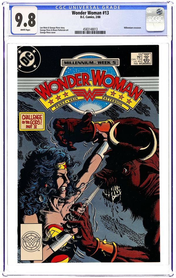 Millennium Week 5. Diana returns from the Green Lantern Corps citadel just in time to help Hippolyte against Polyphemus and the Minotaur in "The Challenge of the Gods Book 4: Demon plague". Part 4 of 4, continued from the previous issue. Some story elements continue into Millennium #7. Script by Len Wein, plot and layouts by George Perez, finishes by Bruce Patterson. Perez cover. 36 pgs. Cover price $0.75.